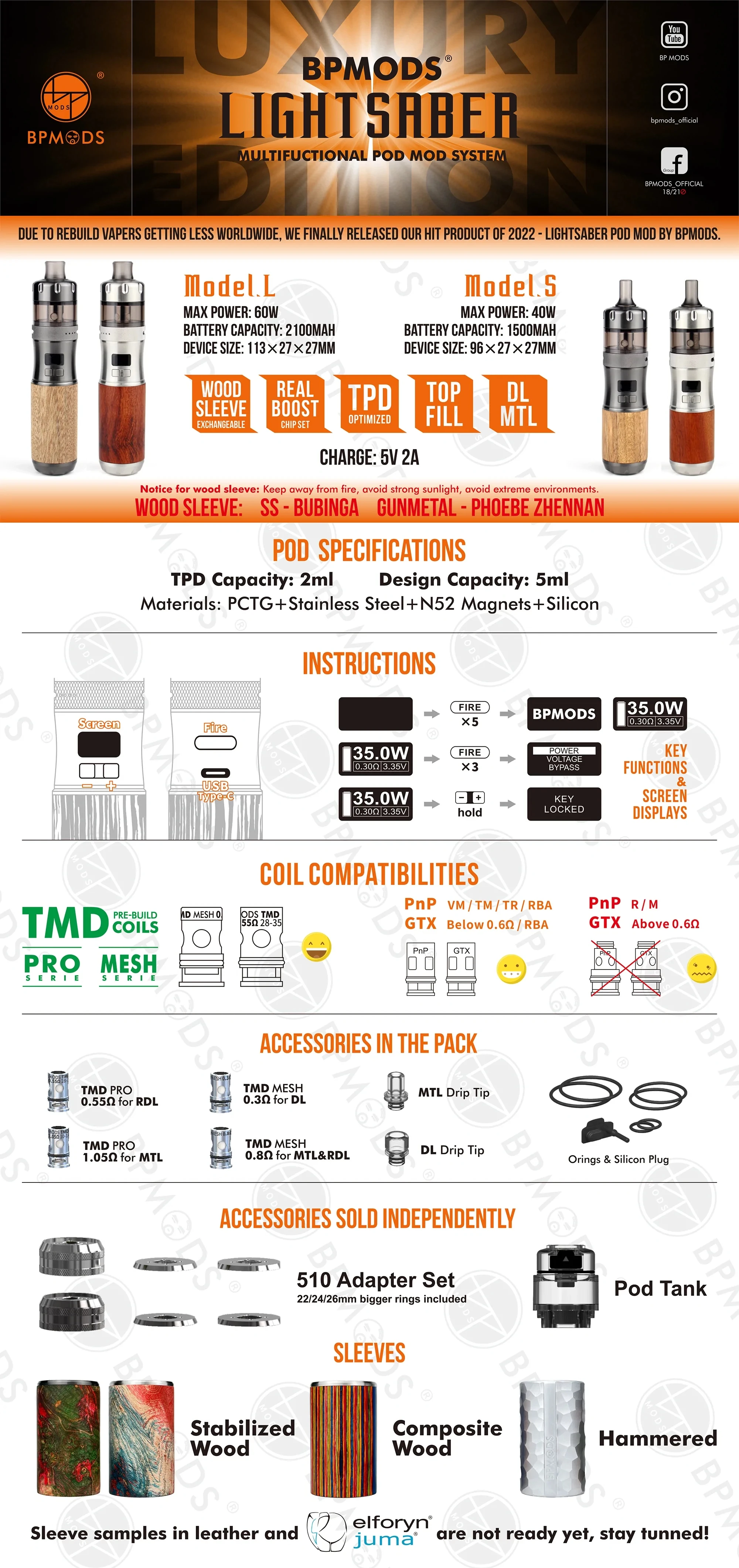 Le Kit complet de sabre laser 2200mAh BP Mods est un système de Mod de dosette multifonctionnel, fabriqué par BP Mods. Le Kit complet se compose du Mod, manchon en bois et réservoir à dosettes, disponibles en différentes couleurs et tailles, en fait, vous pouvez choisir entre la version longue et courte. Ce Mod Pod dispose d’une batterie intégrée de 2200mAh avec une puissance livrable de 60W. La capacité du réservoir est égale à 2ml et il est livré avec 2 bobines TMD. (Les choses peuvent changer sur les Versions de version finale)