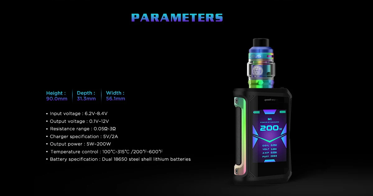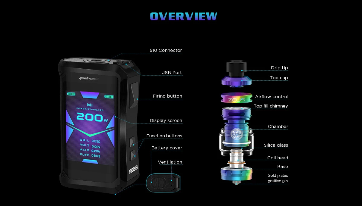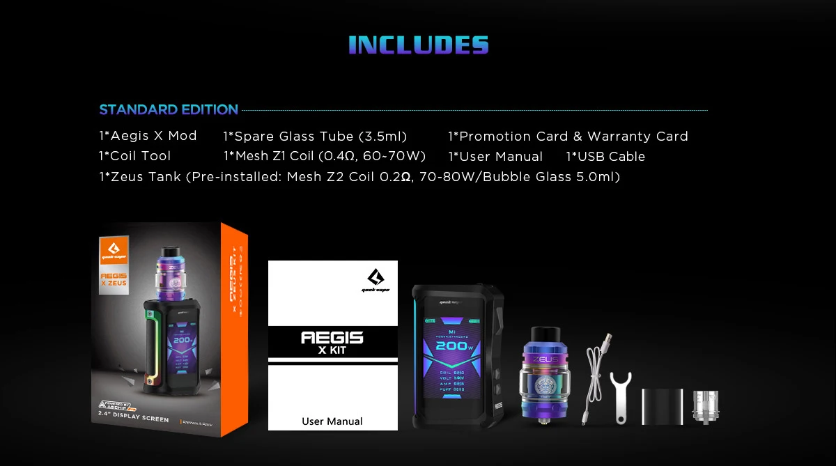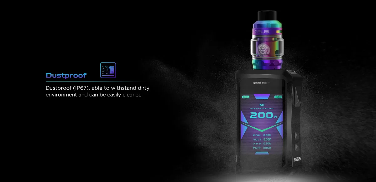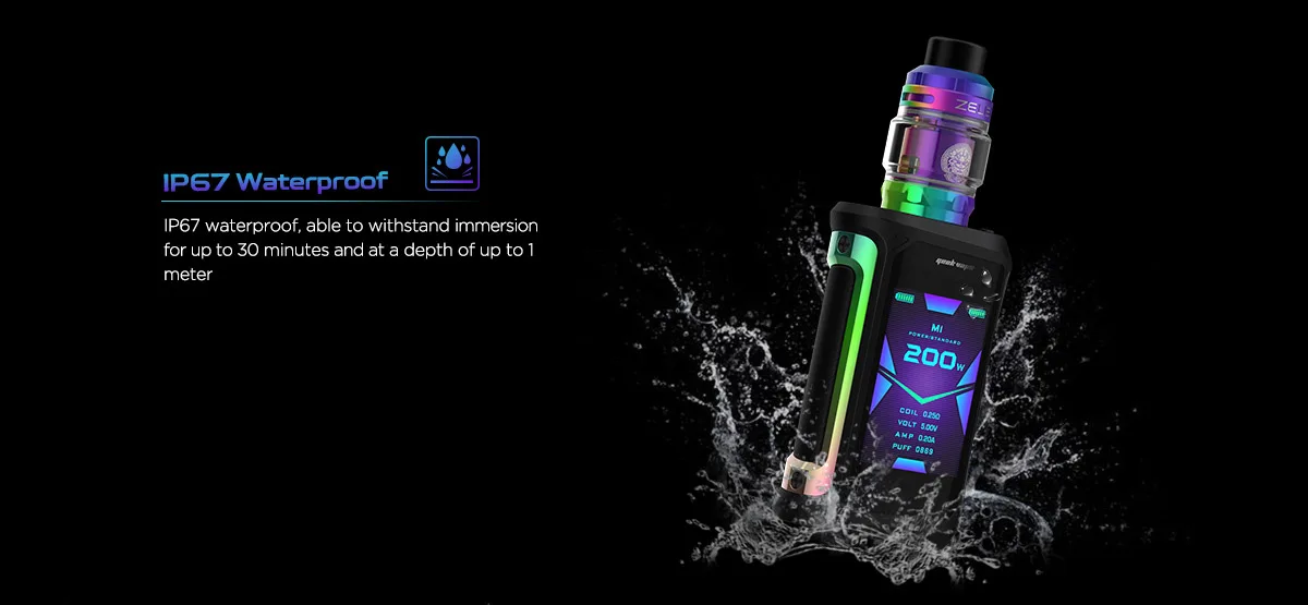 Geekvape Le Kit Aegis X est livré avec un écran OLED de 2.4 pouces, il dispose également d’une fonction IP67 étanche/antichoc/anti-poussière, et d’une charge d’équilibrage de batterie innovante avec protection de la batterie. Et l’expérience utilisateur, Aegis X est le dispositif double batterie le plus avancé à ce jour. Alimenté avec le nouveau jeu de puces AS 2.0 qui est deux fois plus puissant et précis. Le réservoir Geekvape Zeus Sub-Ohm conserve le concept de conception structurelle de la série Zeus d’origine avec un système de bobine préconstruit à changement rapide amélioré. Utilisant la dernière technologie du système de bobine de maille de GV pour optimiser la production de saveur et de vapeur.