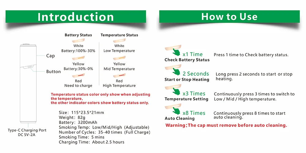 Lambda Air est le dernier appareil portable à chaleur sans brûlure sorti par la marque lambda au printemps 2022. Comparé à la génération précédente Lambda CC, l’air Lambda adopte une coque en aluminium anodisé, avec une couleur plus délicate et un corps plus petit, mais toujours équipé d’une batterie au lithium de haute qualité intégrée de 3200mah, qui prend en charge l’utilisation de plus de 40 cigarettes lorsqu’elles sont complètement chargées et prend en charge le réglage de la température en trois étapes. Fonction de nettoyage automatique de soutien, module de chauffage remplaçable. Poursuivant l’expérience de haute qualité de la génération précédente tout en apportant un nouveau design visuel, je crois qu’il deviendra un article de mode pour vous.
