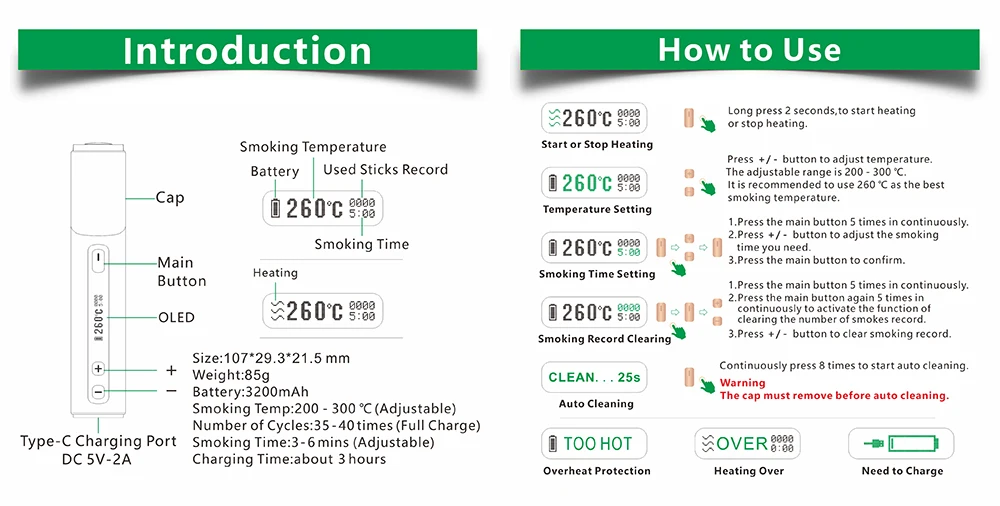 4.) 200 – 300 ℃ température de fumer est réglable, tout est dans votre contrôle!