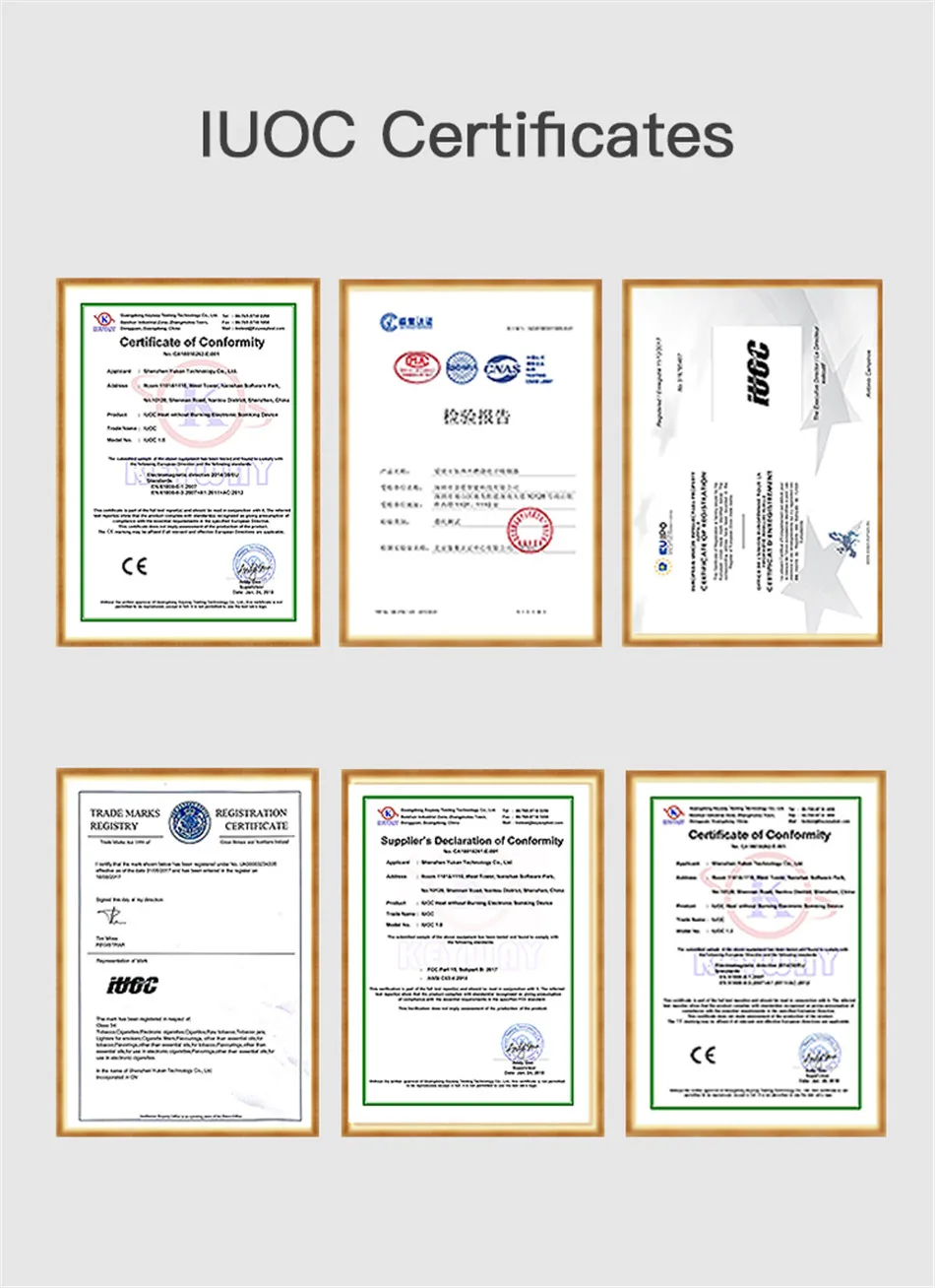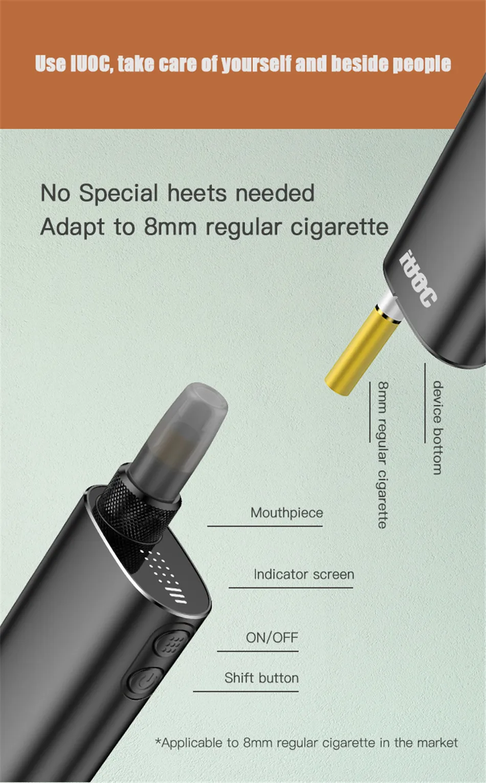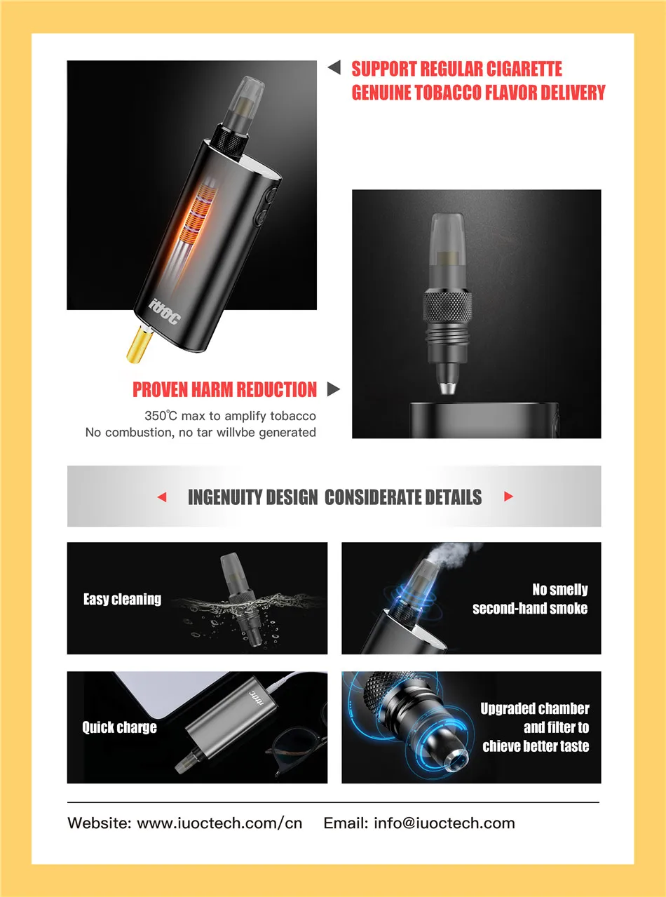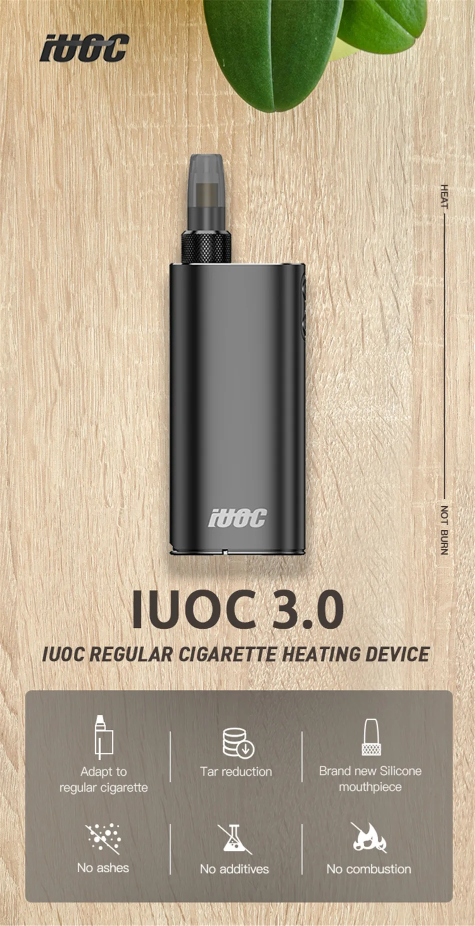 Le dispositif de chauffage régulier de cigarettes IUOC utilise la technologie de chauffage sectionnel externe pour chauffer la cigarette à la température de 350 °C et la garder sans brûlure, ce qui peut réduire considérablement les substances nocives comme le goudron par rapport à la fumée directement. En attendant, il peut fournir la véritable saveur de tabac.