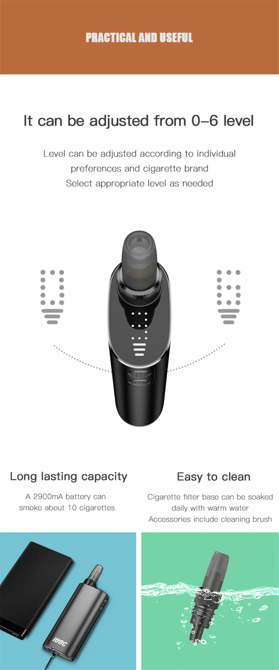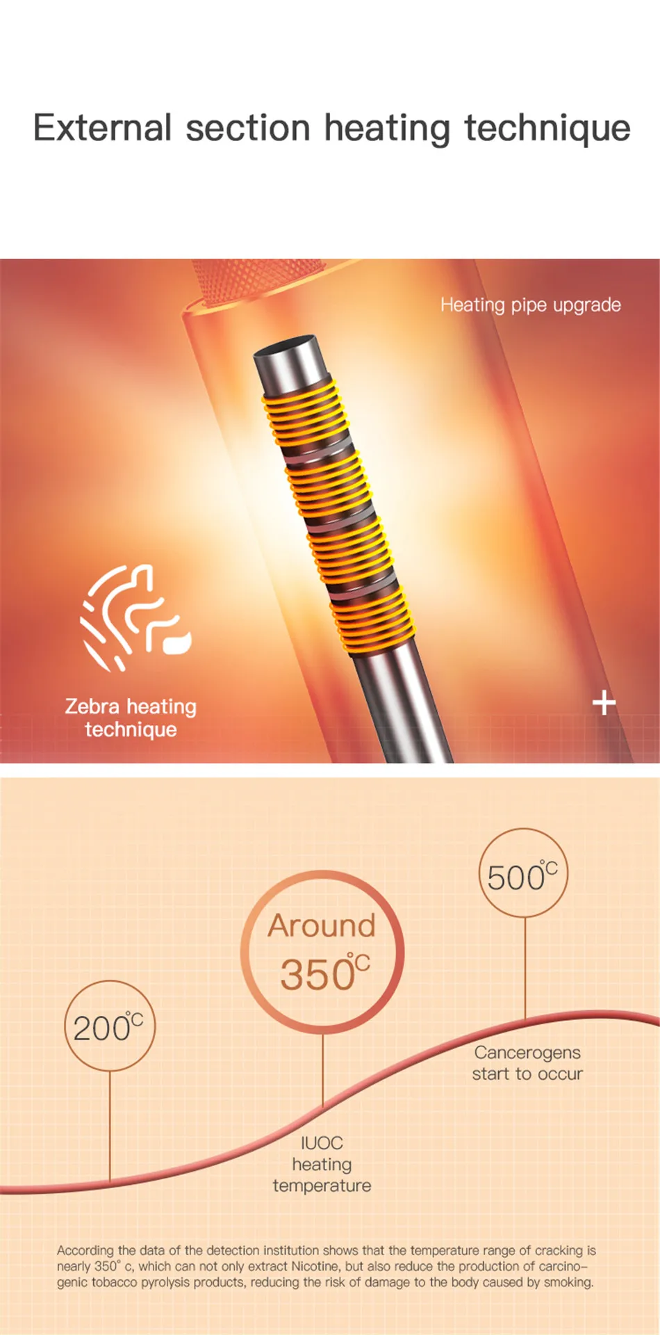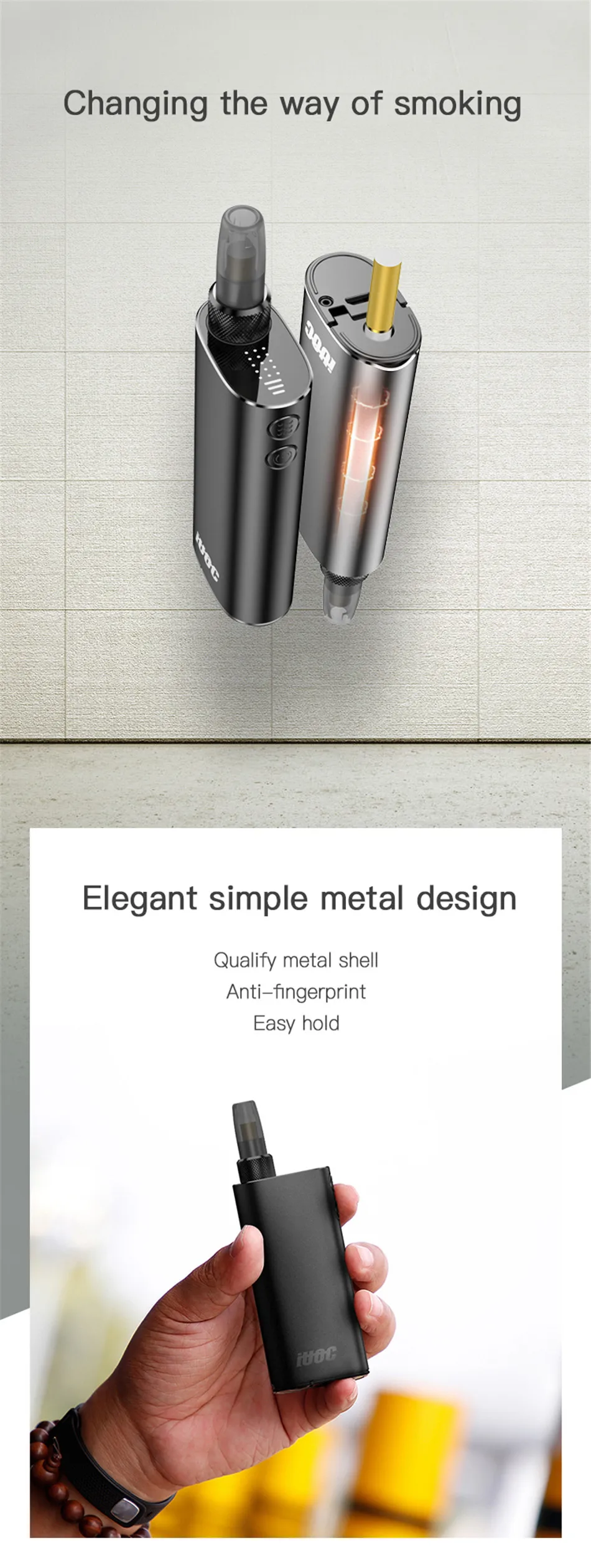 Le dispositif de chauffage régulier de cigarettes IUOC utilise la technologie de chauffage sectionnel externe pour chauffer la cigarette à la température de 350 °C et la garder sans brûlure, ce qui peut réduire considérablement les substances nocives comme le goudron par rapport à la fumée directement. En attendant, il peut fournir la véritable saveur de tabac.