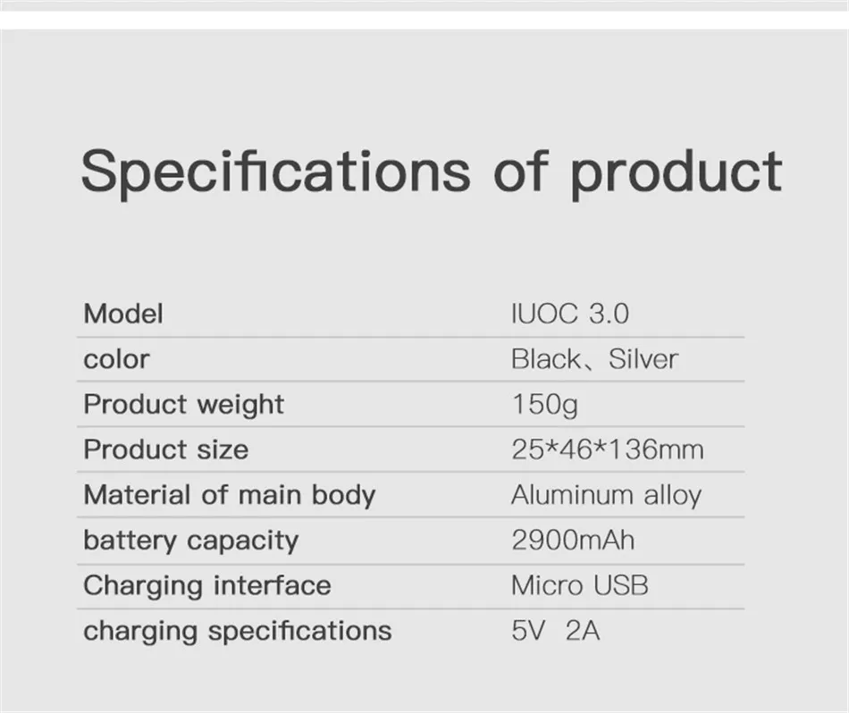 IUOC3.0 peut utiliser environ 13 cigarettes après une charge complète. 5v, 2a charge rapide.