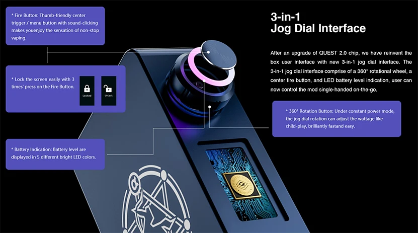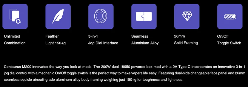 Centaurus M200 MOD est alimenté par deux batteries 18650 externes avec 200W max et type-c charge rapide. Conçu avec l’interférence de cadran 3-en-1 innovante qui est composée d’une roue de rotation de 360 °, d’un bouton d’incendie central et d’une indication de niveau de batterie LED, vous pouvez facilement contrôler le mod à une seule main lors de vos déplacements. L’interrupteur à bascule marche/arrêt mécanique se combine avec le démarrage de 1 seconde peut non seulement vous apporter une vapotage rapide mais éviter la déclenchement accidentelle. Centaurus M200 est équipé du réservoir Centaurus Sub Ohm qui dispose d’une capacité de 5ml, d’un remplissage facile par le haut et d’un système de flux d’air par le haut. Il est compatible avec la bobine UB Max. Il dispose également du panneau facial modifiable double face rapide et facile pour vous permettre de personnaliser n’importe quelle combinaison de couleurs ou de graver votre propre design. Fabriqué en alliage d’aluminium de qualité avion sans soudure de 26mm, il est léger à transporter et durable pour maintenir la robustesse. Juste obtenir il.