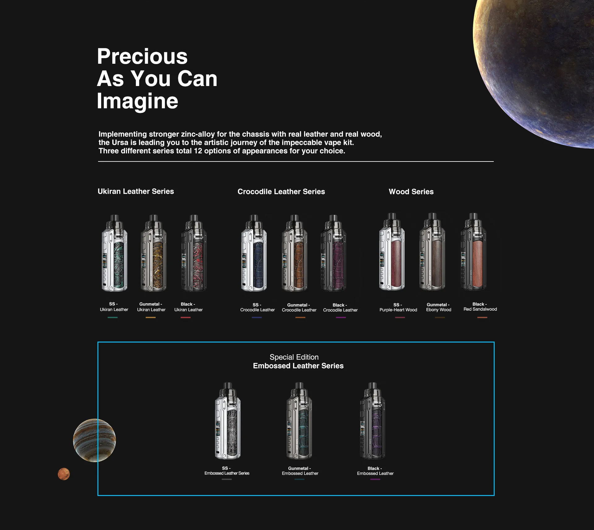 Ursa Quest Multi Kit est un kit incroyable qui est aussi savoureux qu’un réservoir de sub-ohm, plus petit comme un mod pod et puissant comme un mod box. Il est plus proche de la couleur brillante d’origine chaque fois que vous l’utilisez avec un cuir de couleur changeante supérieure. Il est livré avec quatre séries pour répondre à vos préférences: série de cuir Ukiran, série de cuir de Crocodile, série de bois et série de cuir gaufré (veuillez noter que: pour le cuir gaufré, la surface foncée du cuir va progressivement s’estomper après utilisation jour après jour puis montrant la couleur vive originale). Il peut fonctionner avec une seule batterie 21700/20700/18650 et un adaptateur de batterie 18650 est inclus dans l’emballage. Ursa Quest Multi prend en charge la puissance, la tension, TC, VPC, les modes de dérivation et dispose d’une plage de puissance de 5-100W. Il est plus stable que la connexion magnétique avec une serrure à clip innovante. Il