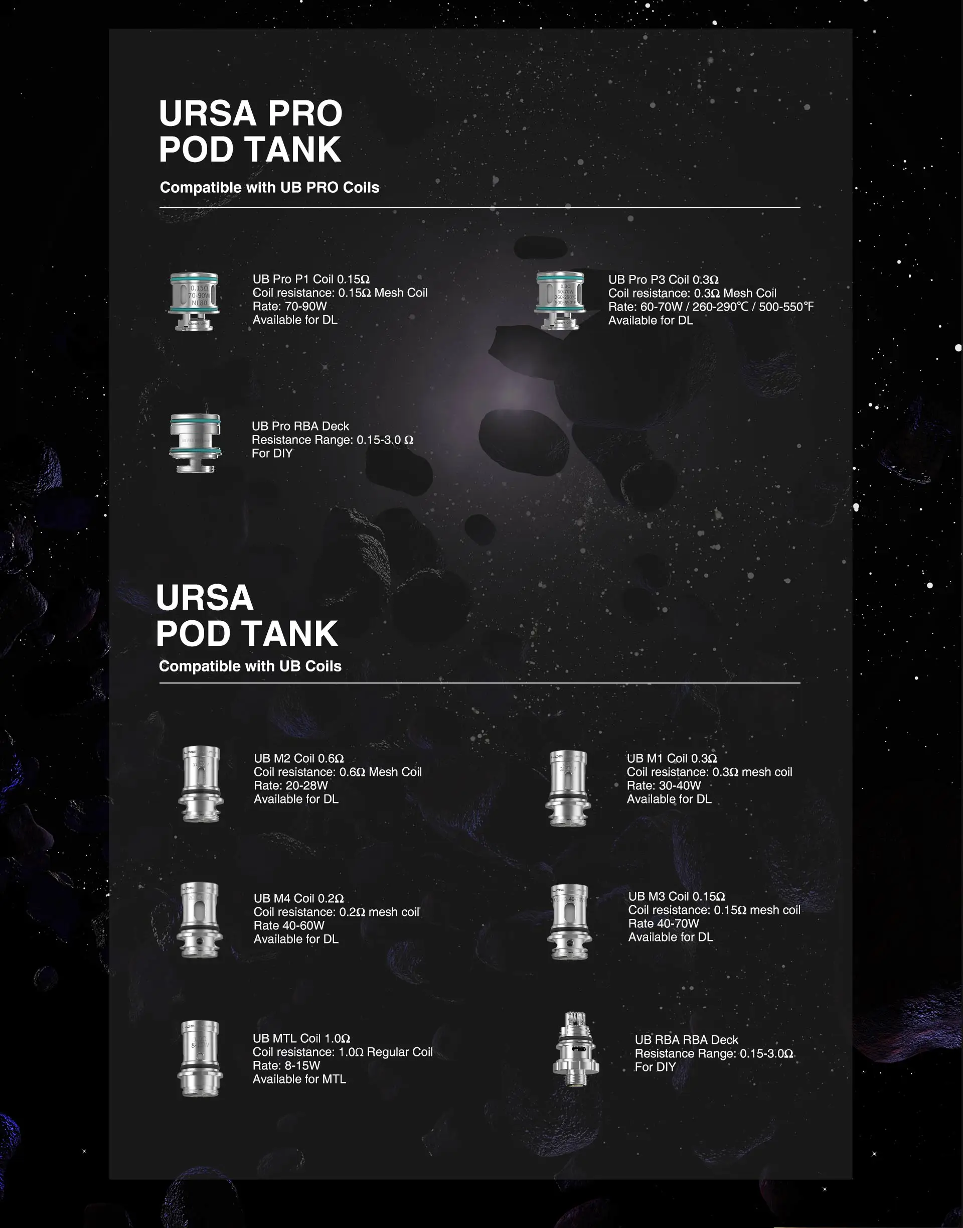Dispose de deux options de réservoir de dosette: réservoir de 7ml Ursa Pro et réservoir de 6ml Ursa pod. De plus, le pod dispose d’une capacité visible, d’un remplissage latéral et d’une large plage de flux d’air (de tous proches à tous ouverts). Le réservoir Ursa Pro Pod est compatible avec les bobines UB Pro: UB Pro P1 0,25 ohm pour DL, UB Pro P3 0,3 ohm pour DL, UB Pro RBA Deck pour bricolage. Le réservoir du Pod Ursa est compatible avec les bobines UB: bobine UB M2 0.6ohm pour DL, bobine UB M1 0.3ohm pour DL, bobine UB M4 0.2ohm pour DL, bobine UB M3 0.15ohm pour DL, bobine UB 1.0ohm pour MTL, plate-forme UB RBA pour bricolage.