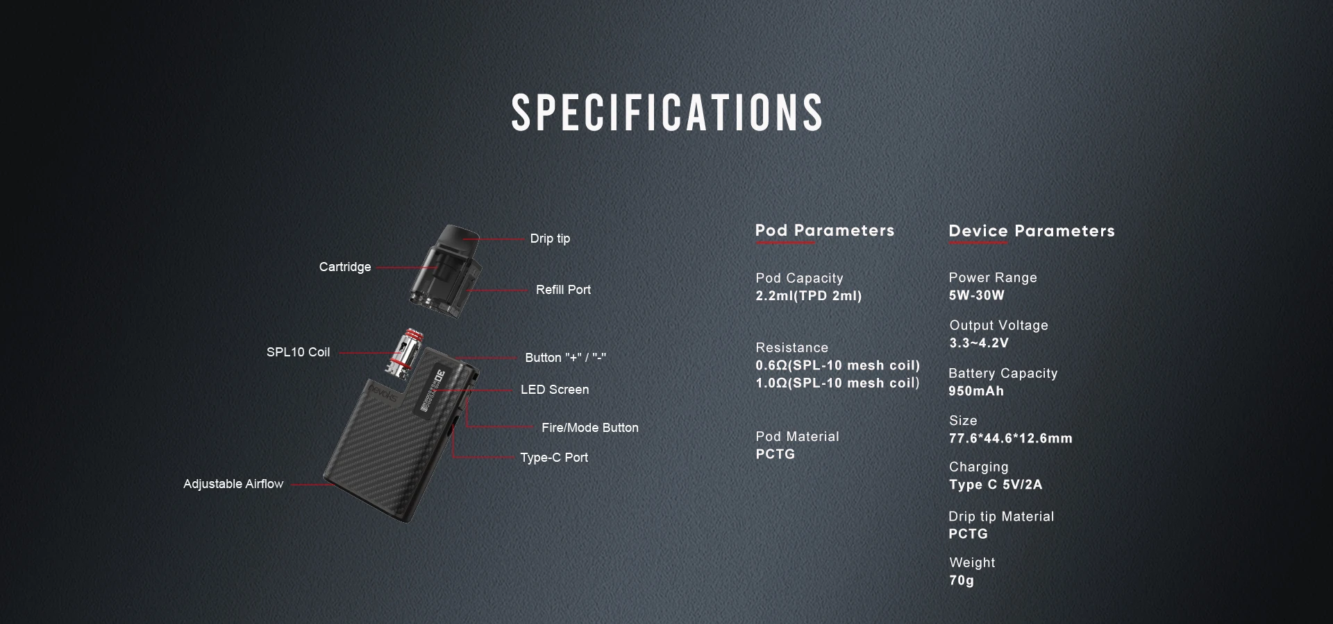 | Pod Cartridge Resistance | 0.6ohm/1.0ohm |