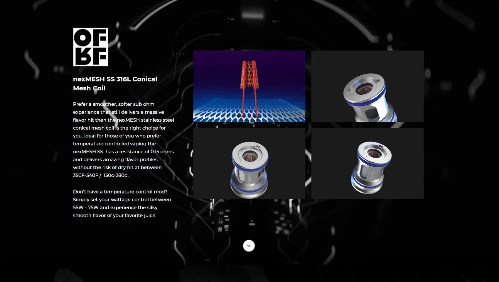 Type de bobine: bobine de maille conique nexMESH SS 316L de 0,15 ohm (40-75W), bobine de maille conique nexMESH A1 de 0,2 ohm (55-85W)