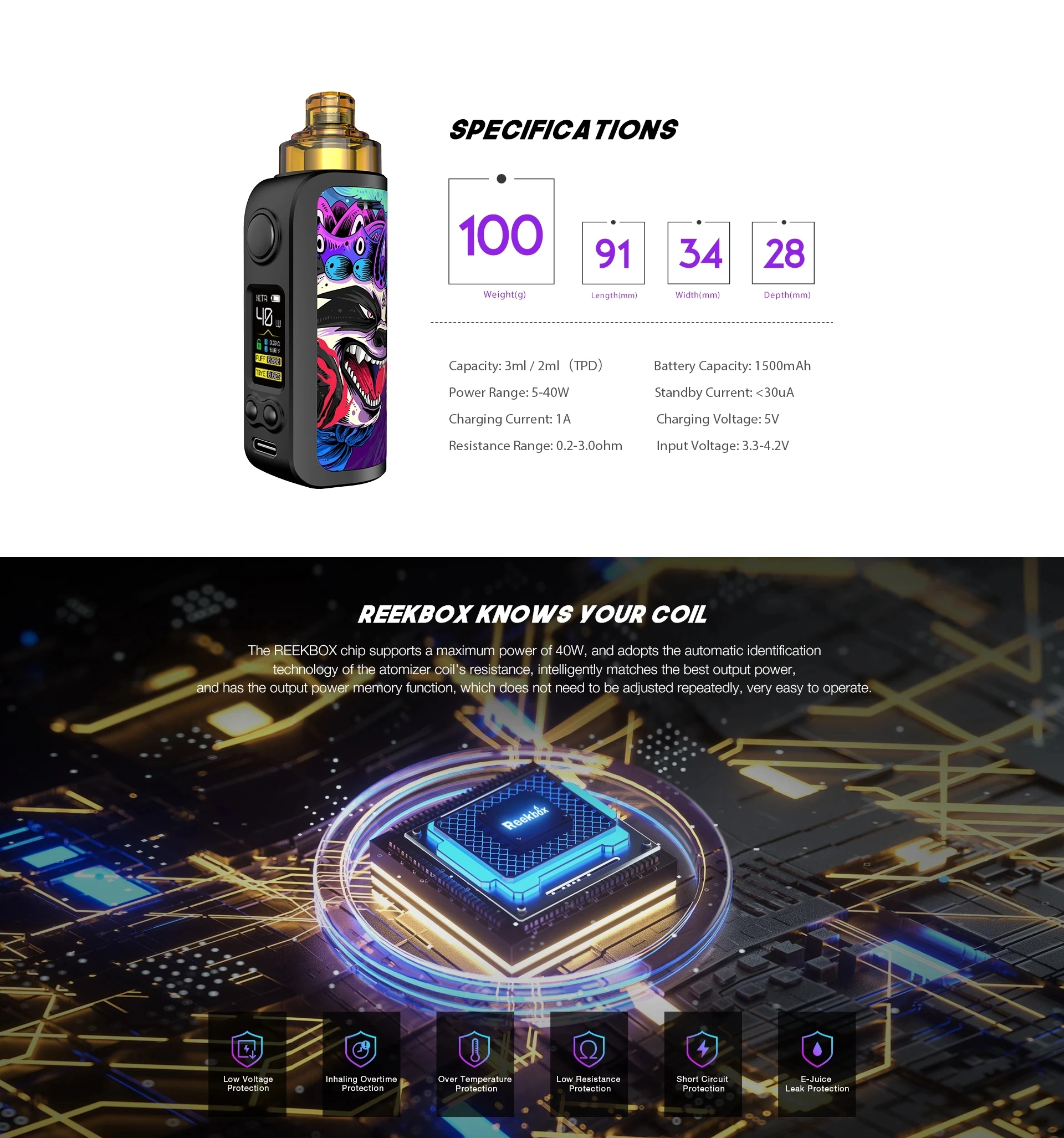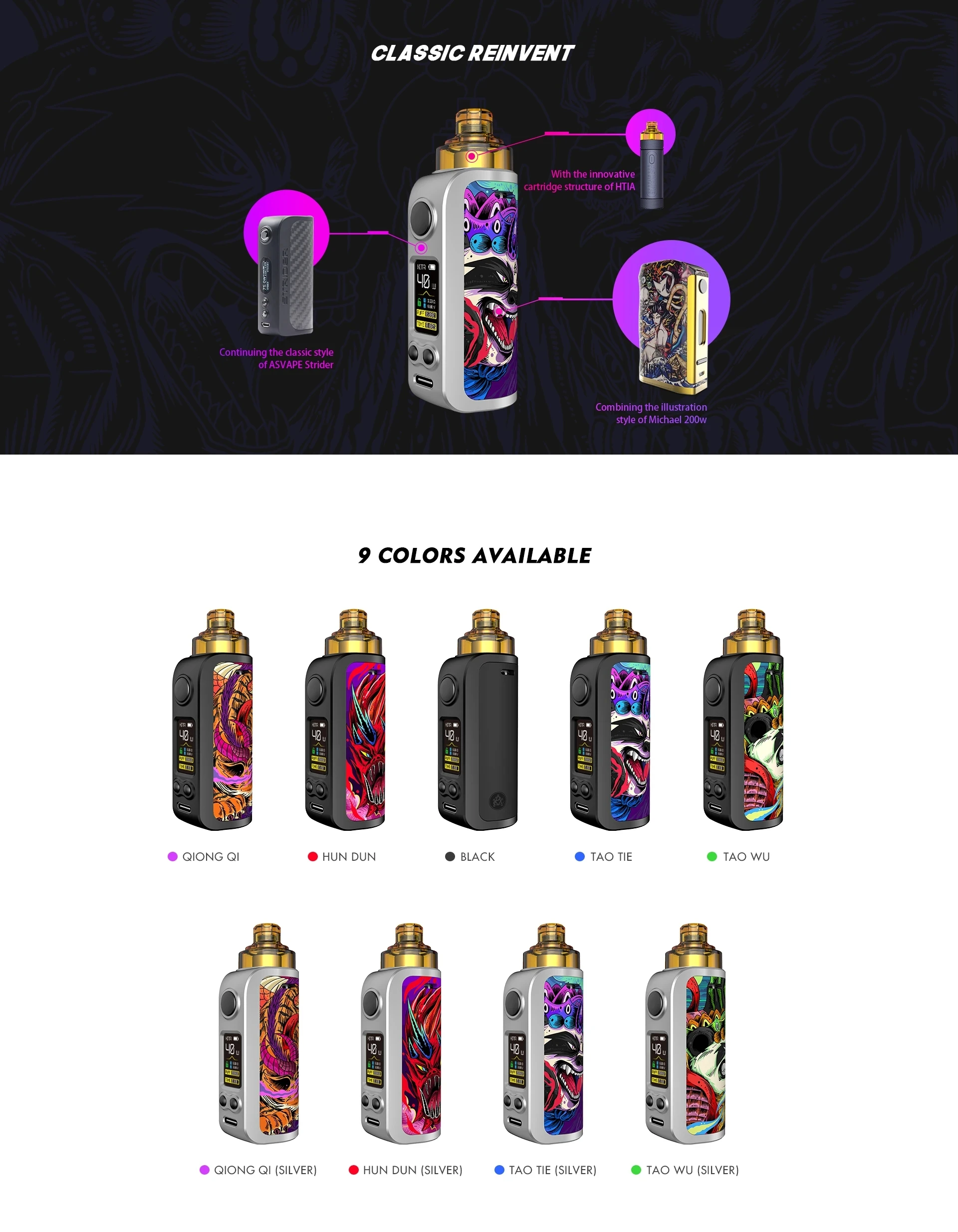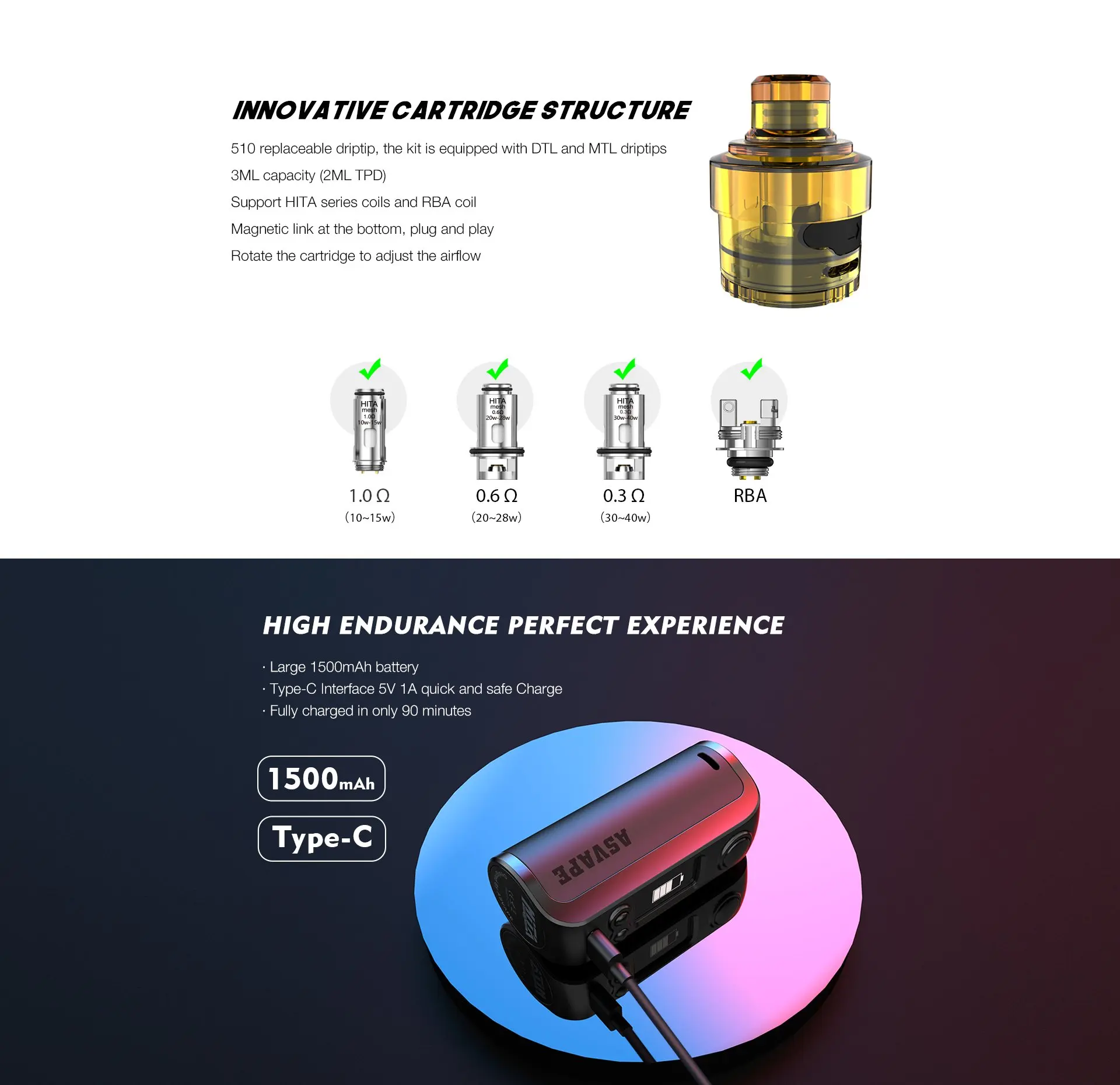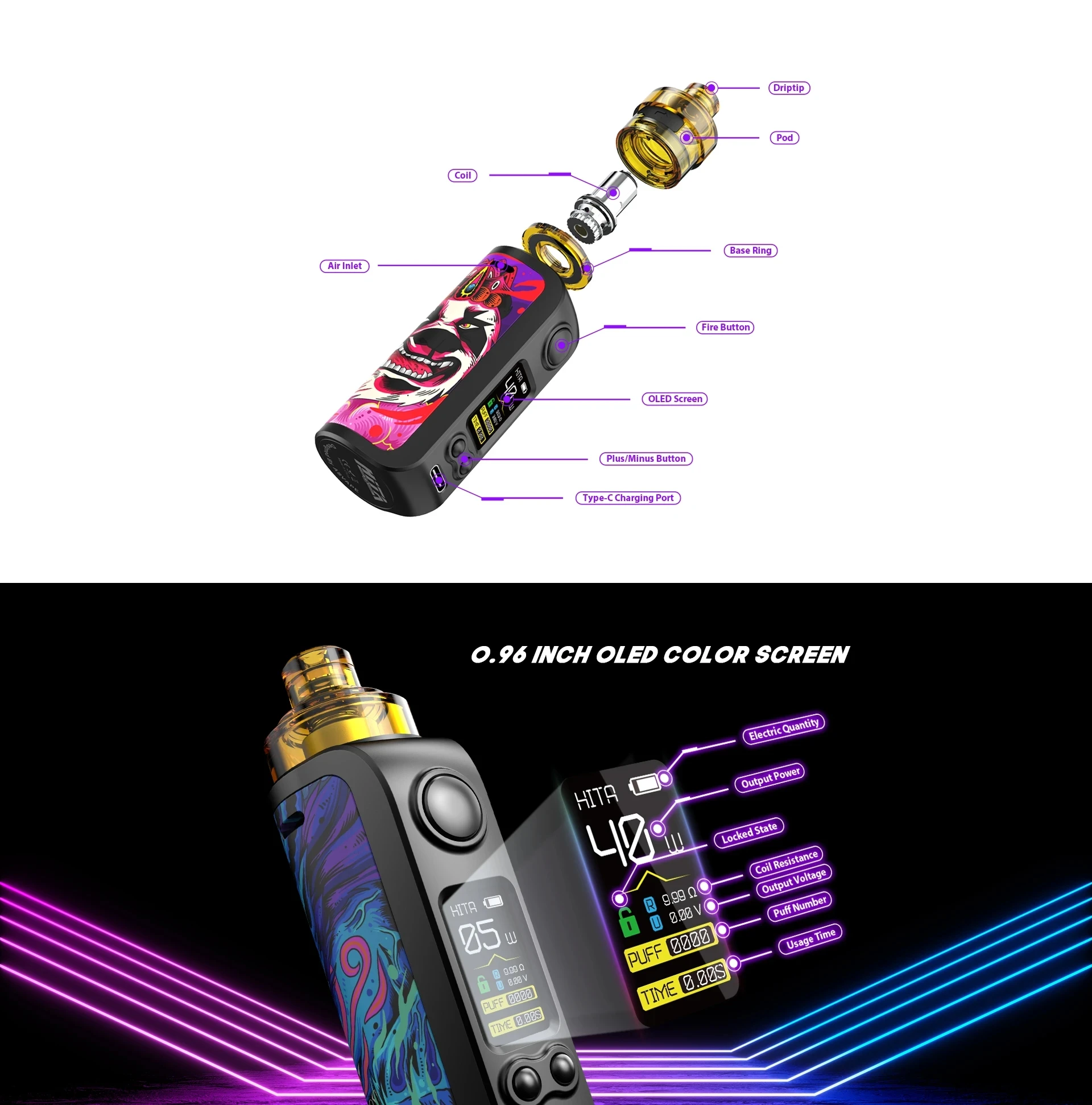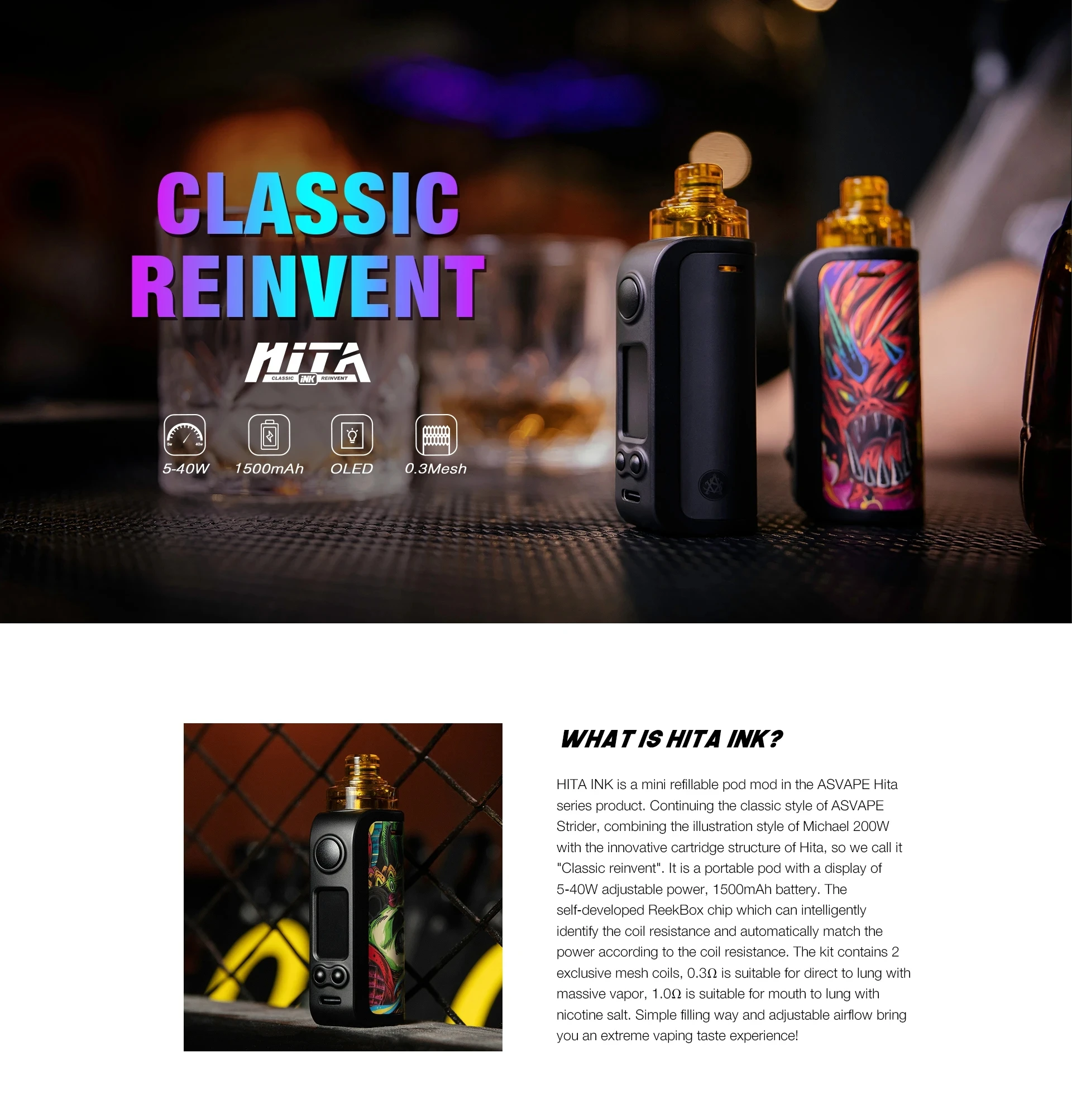 Le Kit de Mod de Pod d’encre Asvape Hita est alimenté par une batterie 1500 intégrée avec une puissance réglable de Mod de Pod d’encre Hita hérite du style classique de Asvape strider, le style d’illustration de Michael 200W et la structure de cartouche innovante de Hita. La cartouche de dosette d’encre Asvape Hita a une capacité de 5ml et une bobine de maille de 0,3 ohm pour la vaporisation DTL, 1.0ohm pour MTL vapotage. Doté d’une puce ReekBox auto-développée pour identifier la résistance de la bobine et correspondre automatiquement à la puissance et d’un écran OLED pour afficher les données de vapotage détaillées.