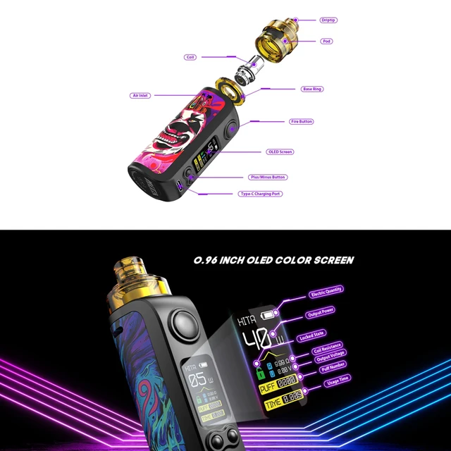 Le Kit de Mod de Pod d’encre Asvape Hita est alimenté par une batterie 1500 intégrée avec une puissance réglable de Mod de Pod d’encre Hita hérite du style classique de Asvape strider, le style d’illustration de Michael 200W et la structure de cartouche innovante de Hita. La cartouche de dosette d’encre Asvape Hita a une capacité de 5ml et une bobine de maille de 0,3 ohm pour la vaporisation DTL, 1.0ohm pour MTL vapotage. Doté d’une puce ReekBox auto-développée pour identifier la résistance de la bobine et correspondre automatiquement à la puissance et d’un écran OLED pour afficher les données de vapotage détaillées.