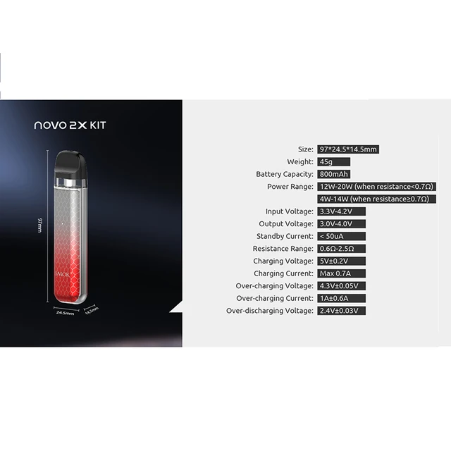 | Compatible Pod (Kit included) | NOVO 2X Meshed 0.9ohm MTL Pod |