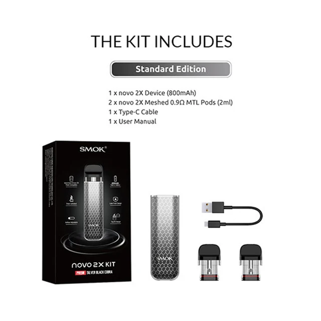 Le Kit SMOK Novo 2X est livré avec la série Novo et peut être entièrement compatible avec les dosettes Novo/Novo 2/Novo 2S/Novo 2X. Performant ultra-léger, il est équipé d’une batterie interne de 800mAh, d’une sortie max 20W, et d’une dosette Novo 2X de 2ml avec une bobine de maille intégrée de 0,9ohm. Fini avec MTL vaping, il vous donne fraîcheur et saveur recherchée avec VG: PG 50:50 e-liq uids ou sels de nicoti ne. Il est activé par tirage et n’a pas de bouton dessus, la dosette détient une capacité de 2ml et dispose d’un système de remplissage supérieur, intégrant le flux d’air réglable, il correspond absolument aux amateurs de MTL.