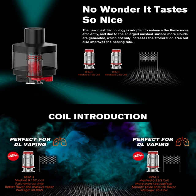 La bobine RPM 3 utilise la nouvelle technologie de maille pour augmenter la zone d’atomisation et améliorer le taux de chauffage. Il est parfait pour DL vaping et compatible avec le Kit SMOK RPM 5 (Pro). Il existe deux types de résistance de bobine: bobine maillée de 0,15 ohm et bobine maillée de 0,23 ohm. 5 pièces par paquet.