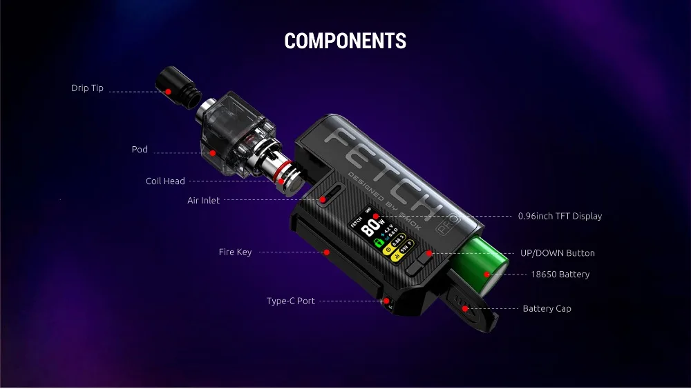 Dimensions: 76mm x 42.8mm x 18.4mm capacité de la cartouche: 3.7ml capacité de la batterie: 1200mAh tension de sortie: 0.5V – 4.1V puissance de sortie: 5W – 40W charge: plage de résistance maximale de 1,2a: 0,3ohm-2,5ohm temps de tir: 0.001s écran: écran TFT de 0.96 pouces Port de chargement: Micro USB couleur de chargement: violet, bleu