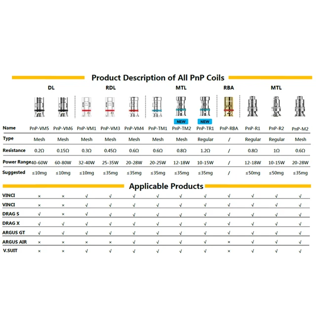 Cependant, si vous avez un Kit de dosettes V Suit qui ne monte que jusqu’à 40W, alors assurez-vous que les bobines PnP que vous choisissez nécessitent 40W ou moins. Nous ne vous recommandons donc pas d’acheter le PnP-VM6 ou le PnP-VM5 pour le Kit V Suit Pod.