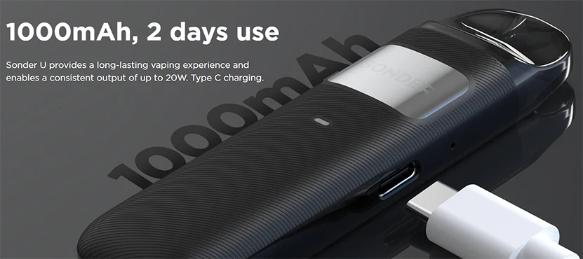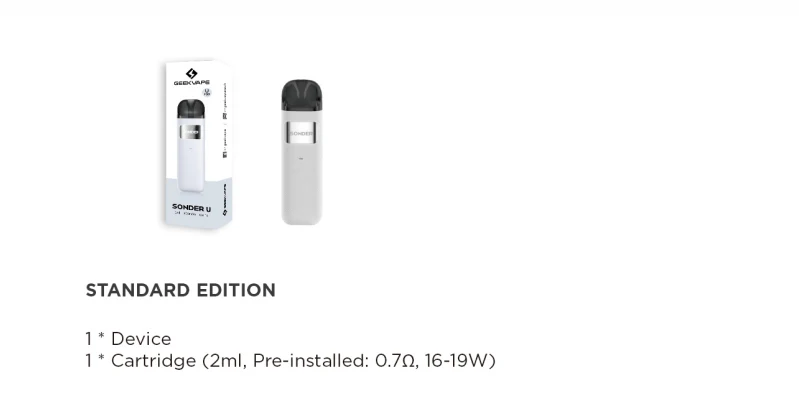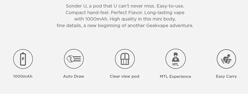 Le Sonder U Kit est alimenté par une batterie intégrée de 1000mAh avec 20W max et une charge type-c. Conçu avec un corps mince, Sonder U est facile à transporter et confortable à tenir. Il n’a pas de bouton et adopte une conception de dessin automatique pour être convivial pour tous. Sonder U est compatible avec la cartouche GeekVape U avec une capacité de 2ml de jus électronique et une résistance de bobine de 0,7 Ω pour vous offrir une expérience de vapotage MTL et DTL limitée. Le pod clear view permet de vérifier facilement le niveau de jus électronique. Adapté au jus électronique de sel nic, Sonder U est le meilleur pour les débutants.