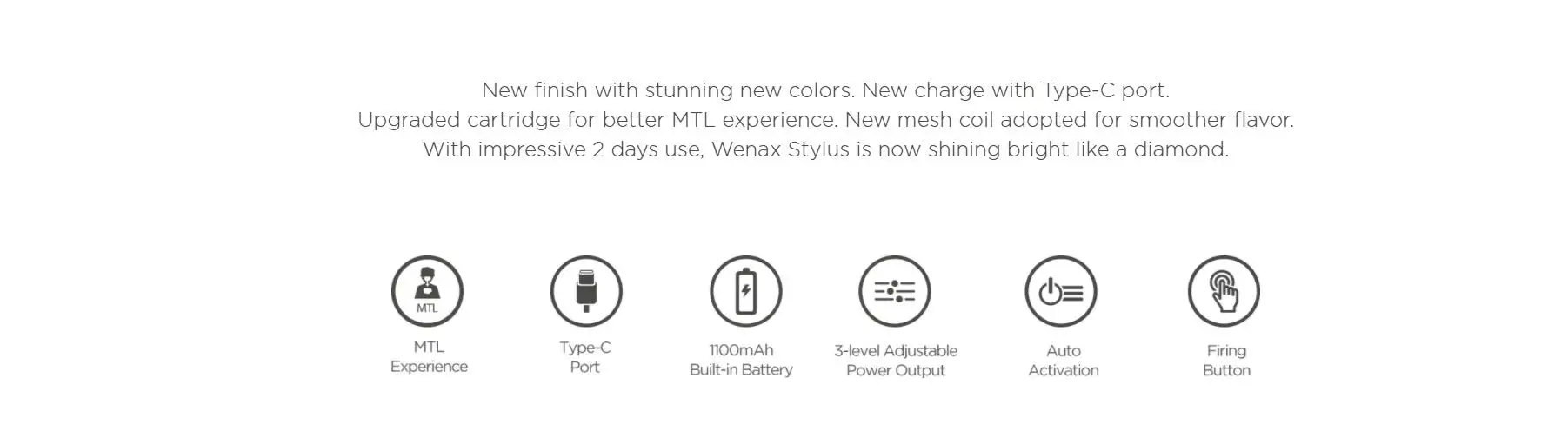 Geekvape Wenax S-C Kit 2ml 1100mAh est une nouvelle finition avec de superbes nouvelles couleurs. Nouvelle charge avec port type-c. Cartouche améliorée pour une meilleure expérience MTL. Nouvelle bobine de maille adoptée pour une saveur plus douce. Avec une utilisation impressionnante de 2 jours, le stylet Wenax brille désormais comme un diamant.