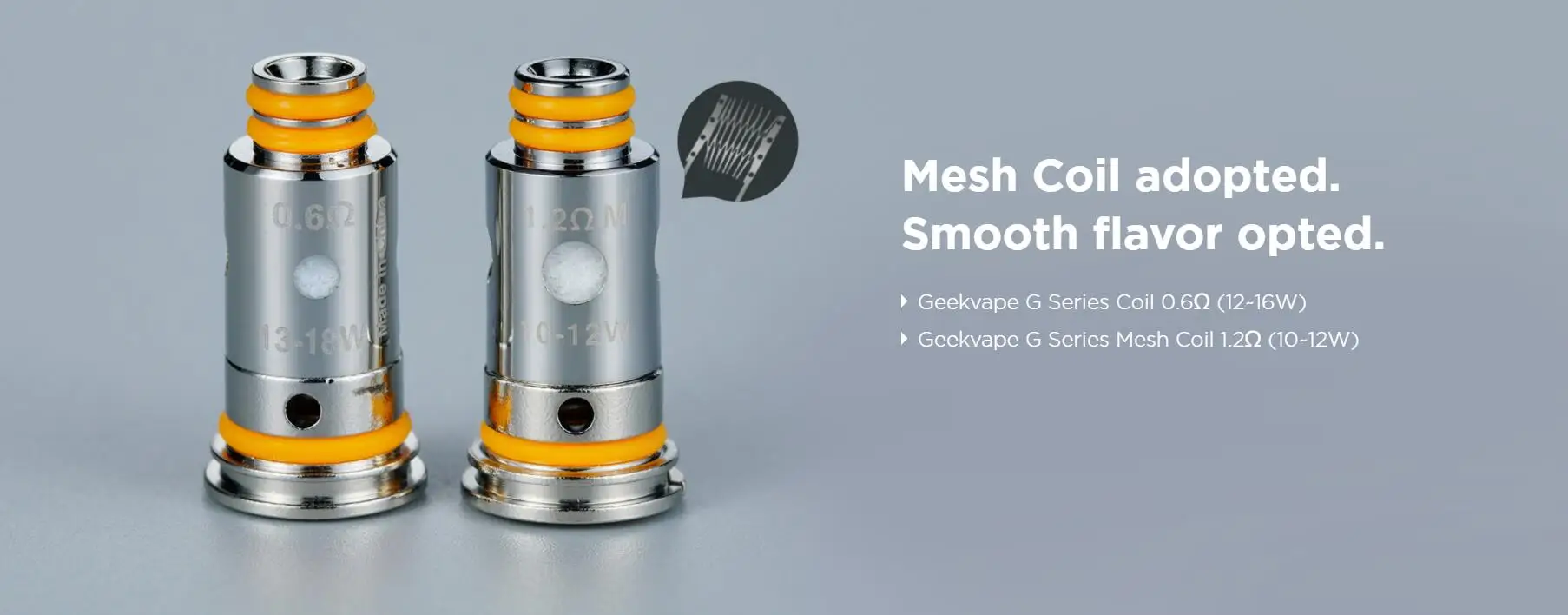 2x bobines geekvaeep série G (préinstallées: 0,6 ohm, 13-18W; Rechange: 1,2 ohm, 10-12W)