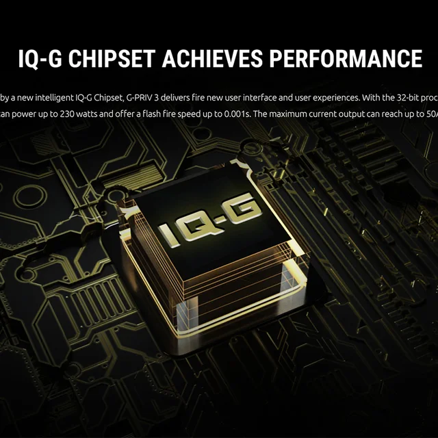 G-PRIV 3 Mod, un tout-rond mise à niveau à la fois dans le logiciel et le matériel boîte mod, est alimenté par deux 18650 batteries en série avec 230W max. Conduit par un nouveau intelligent IQ-G chipset, il délivrera feu nouvelle interface utilisateur et une expérience utilisateur. Et il est équipé d’un grand écran tactile de 2.4 pouces pour vous montrer les informations dont vous avez besoin d’un simple clic. Il adopte également un bouton indépendant pour verrouiller/déverrouiller l’écran facilement. En outre, il utilise un port USB type-c, qui transportera plus de puissance et offrira une vitesse de transfert plus rapide. De plus, il offre plusieurs types de protections pour éviter les risques potentiels.
