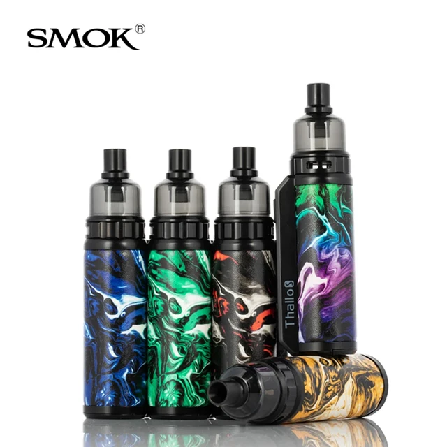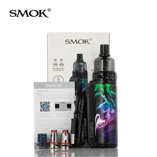 SMOK Thallo Pod Mod Kit adopte un alliage de zinc métallique et une conception de poignée en cuir souple avec des motifs lisses multicolores. Le design robuste et résistant combine un fort impact visuel mais a également une sensation ergonomique et confortable, réajusté la série Pod Mod standard. Le Kit SMOK Thallo est doté d’une batterie rechargeable 3000mAh intégrée et d’un port de charge type-c. La batterie de grande capacité prolonge le temps de veille et peut être complètement chargée en peu de temps. Le SMOK Thallo dispose du dernier jeu de puces IQ-XS de SMOK. La toute nouvelle puce IQ-XS accompagne la sortie 80W max, le temps de mise à feu instantané 0.001s et de multiples protections de sécurité. L’écran couleur de 0.96 pouces affiche clairement le niveau de pourcentage de la batterie, la puissance de sortie actuelle et d’autres données de vapotage.