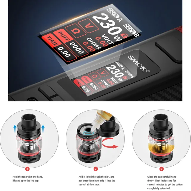 Le réservoir TFV9 dispose d’un système coulissant à remplir pour des recharges d’e-liquide simples et sûres.