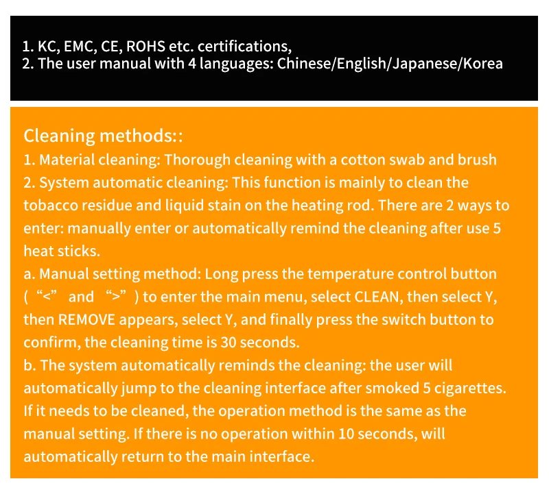 1. Nettoyage des matériaux: nettoyage en profondeur avec un coton-tige et une brosse 2. Système de nettoyage automatique: cette fonction est principalement de nettoyer les résidus de tabac et les taches liquides sur la tige chauffante. Il y a 2 façons d’entrer: entrer manuellement ou rappeler automatiquement le nettoyage après utilisation de 5 bâtons thermiques.