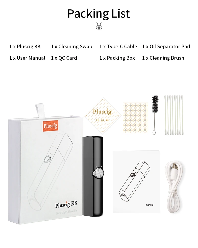1 x Pluscig K8 1 x tampon de nettoyage 1x câble type-c 1x séparateur d’huile pad1x manuel d’utilisation 1x carte QC 1x boîte d’emballage 1x brosse de nettoyage