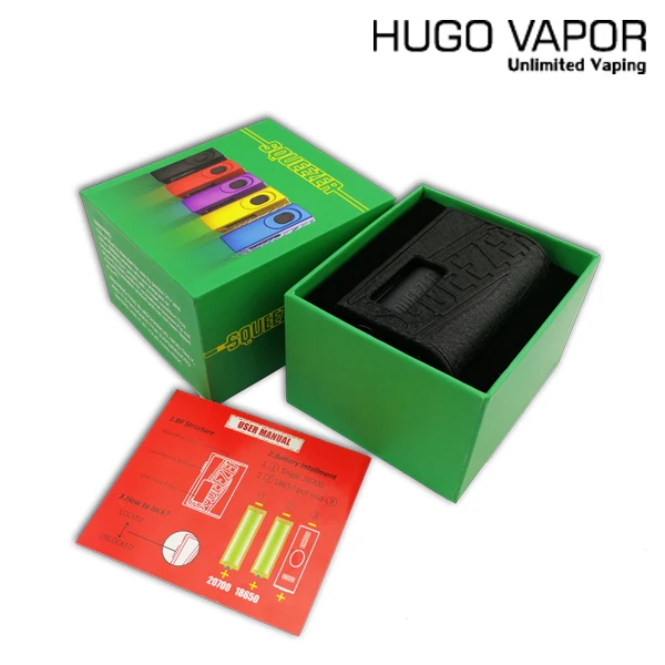 Kit de presseur de vapeur Hugo, comprend un Mod mécanique Squonk et un N RDA. Le Box Mod est livré avec une bouteille en silicone de grande capacité de 10ml, qui est compatible avec les batteries 18650 et 20700. Doté de l’interrupteur de feu verrouillable, du nouveau nylon et de la fibre, il est tellement intelligent pour prévenir le feu automatique accidentel. Le Hugo Vapor squeeze BF Mod est également équipé d’une broche plaquée or qui présente une bonne conductivité.