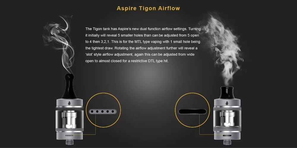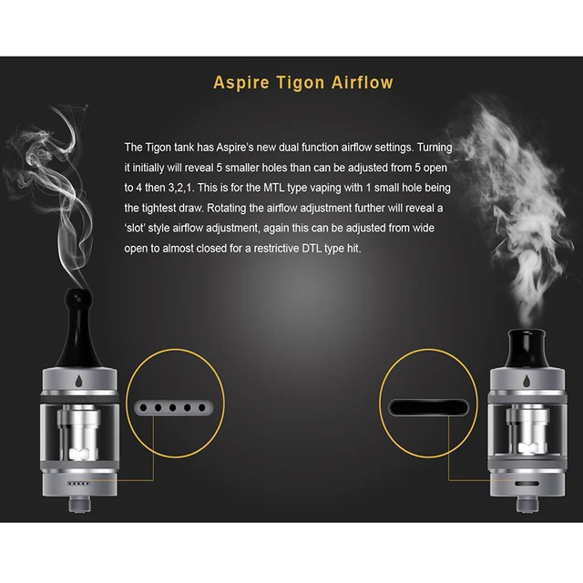 Le réservoir Tigon a les nouveaux réglages de flux d'air à double fonction d'aspire. Le fait de le tourner au départ révélera 5 trous plus petits que ceux qui peuvent être réglés de 5 ouverts à 4 puis 3,2, 2. Ceci est pour le vapotage de type MTL avec 1 petit trou étant le tirage le plus serré. La rotation du réglage du flux d'air révélera un réglage du flux d'air de style «paresseux», encore une fois cela peut être ajusté de grand ouvert à presque fermé pour un coup de type DTL restrictif.