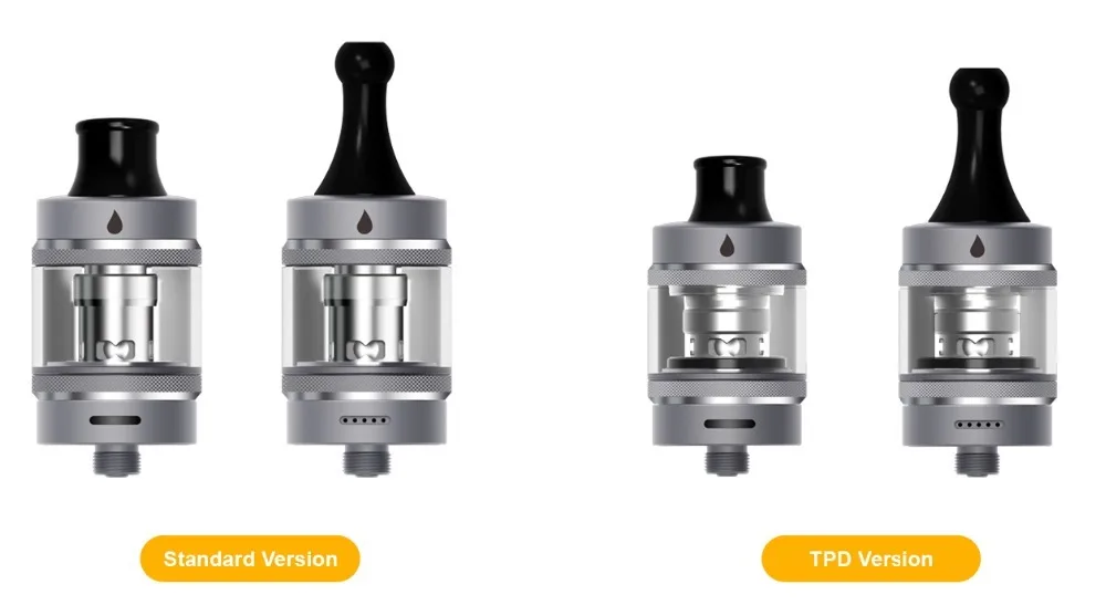 Le réservoir Tigon est livré avec un choix de MTL, un style plus long, une pointe d'égouttement et une pointe d'égouttement de style «trapu» légèrement plus large, plus adaptée aux coups de DTL restreints.