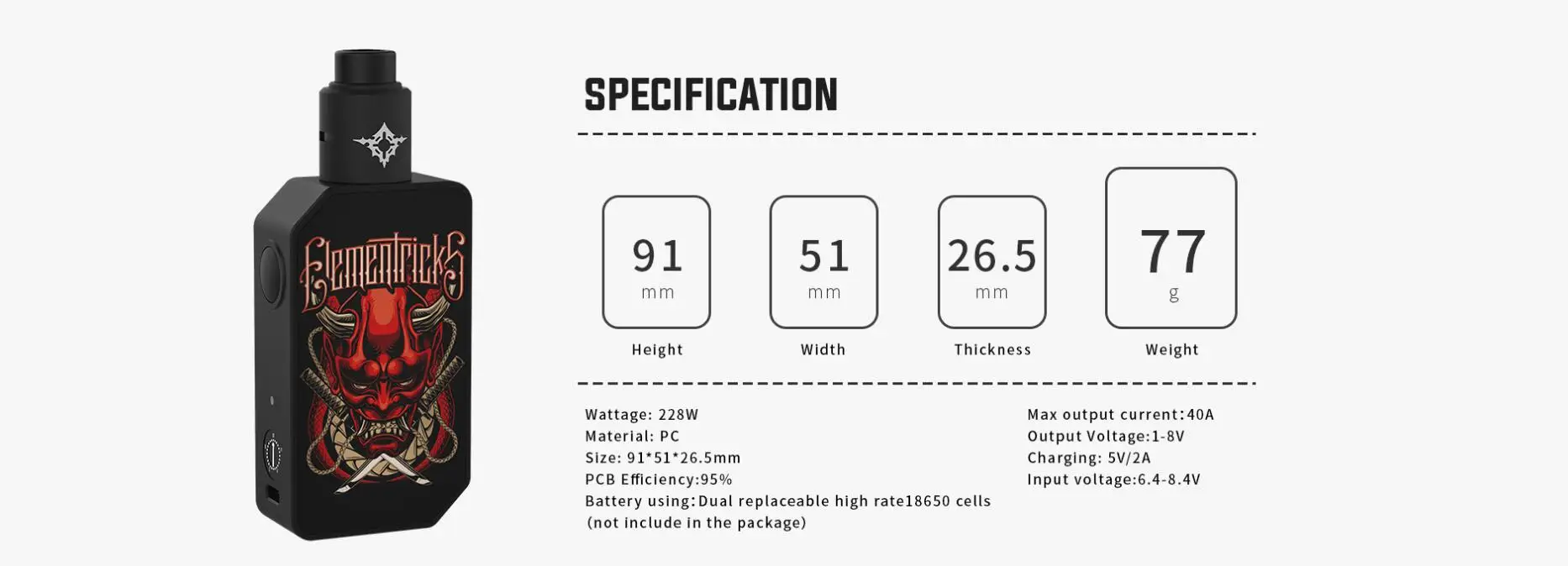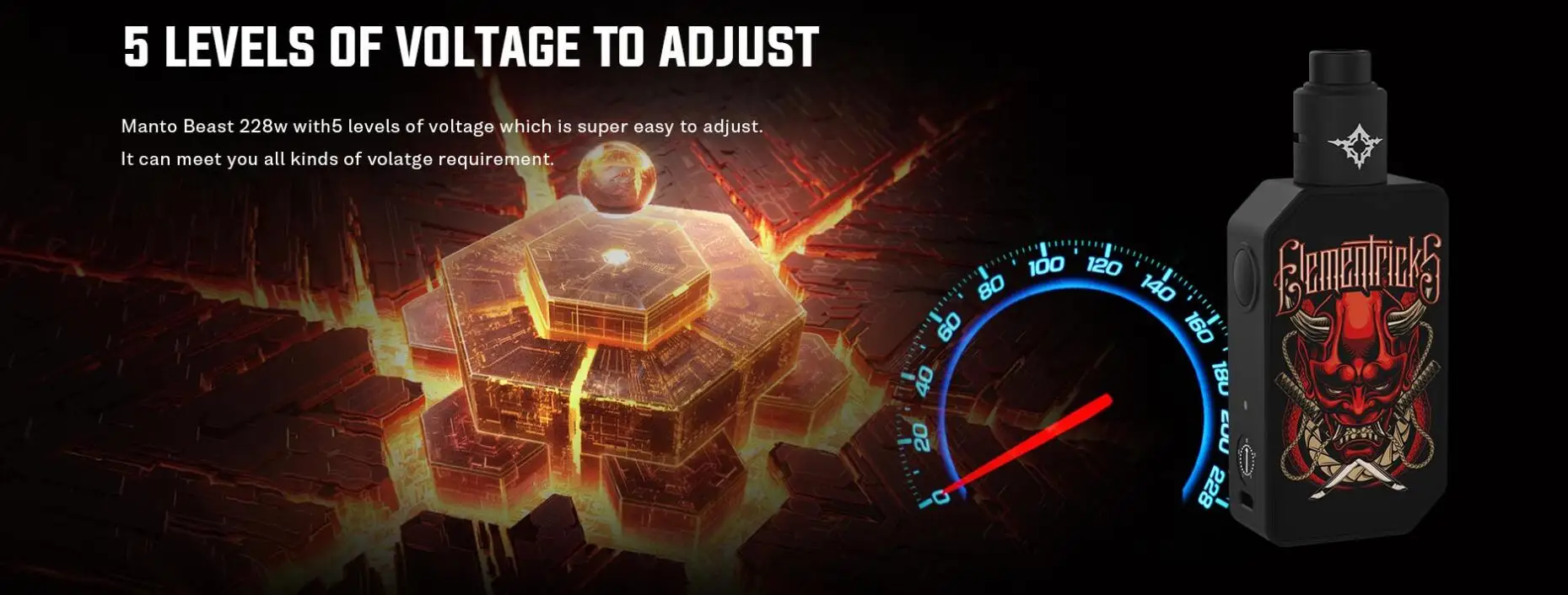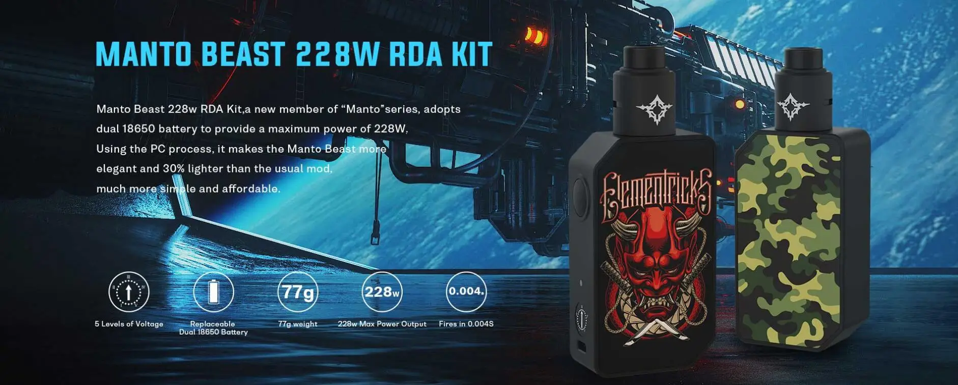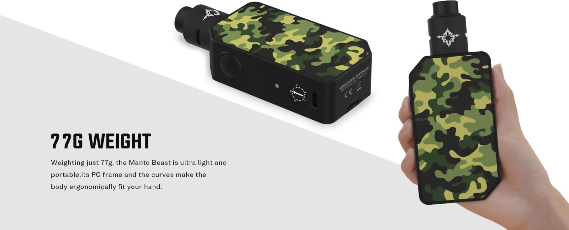 Manto Beast RDA Kit est un nouveau membre de la série Manto qui se compose de Manto Beast 228W Mod et Metis RDA. Le Manto Beast Mod est alimenté par deux batteries 18650 pour fournir une puissance maximale de 228W. Fabriqué en matériau PC, Manto Beast est élégant et 30% plus léger que le mod habituel. Il est livré avec 5 niveaux de tension pour répondre à vos différentes exigences de vapotage. Le Metis RDA dispose d’un pont simple qui est facile à construire et à mèche. Avec une pointe d’égouttage large de 810, le nuage massif vous est également fourni. Il existe plusieurs protections pour assurer votre sécurité: surchauffe/batterie inversée/surcharge/court-circuit/coupure 10s/Protection basse tension.