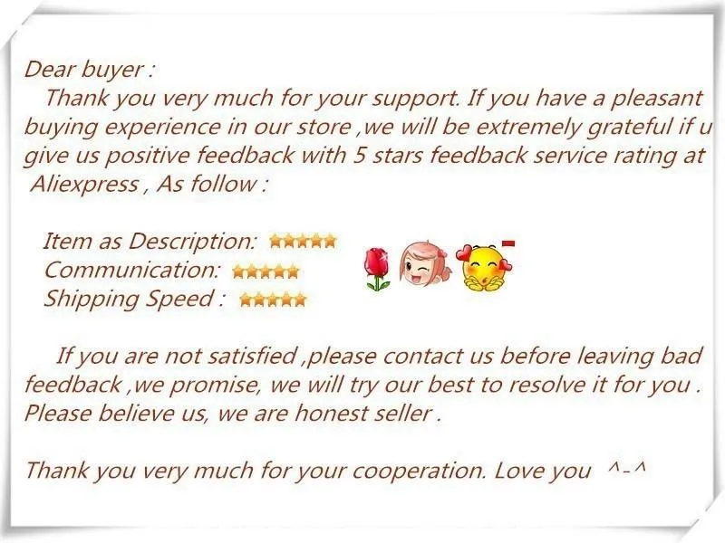 1. We will try our best to serve our customers. All the goods are inspected before shipment, so if you are not satisfied with the purchase, you can exchange the items in 7 days and you must contact us within 24 hours of the receipt of your purchase.