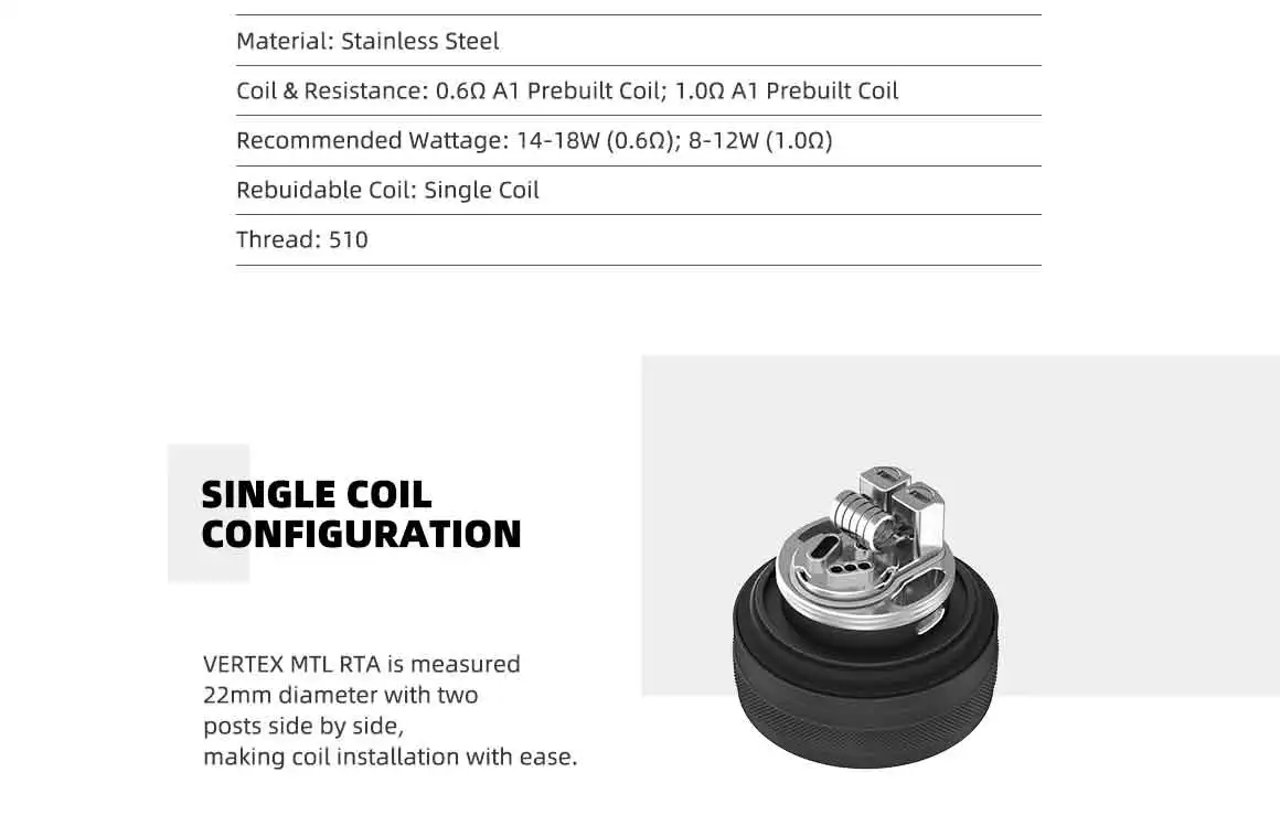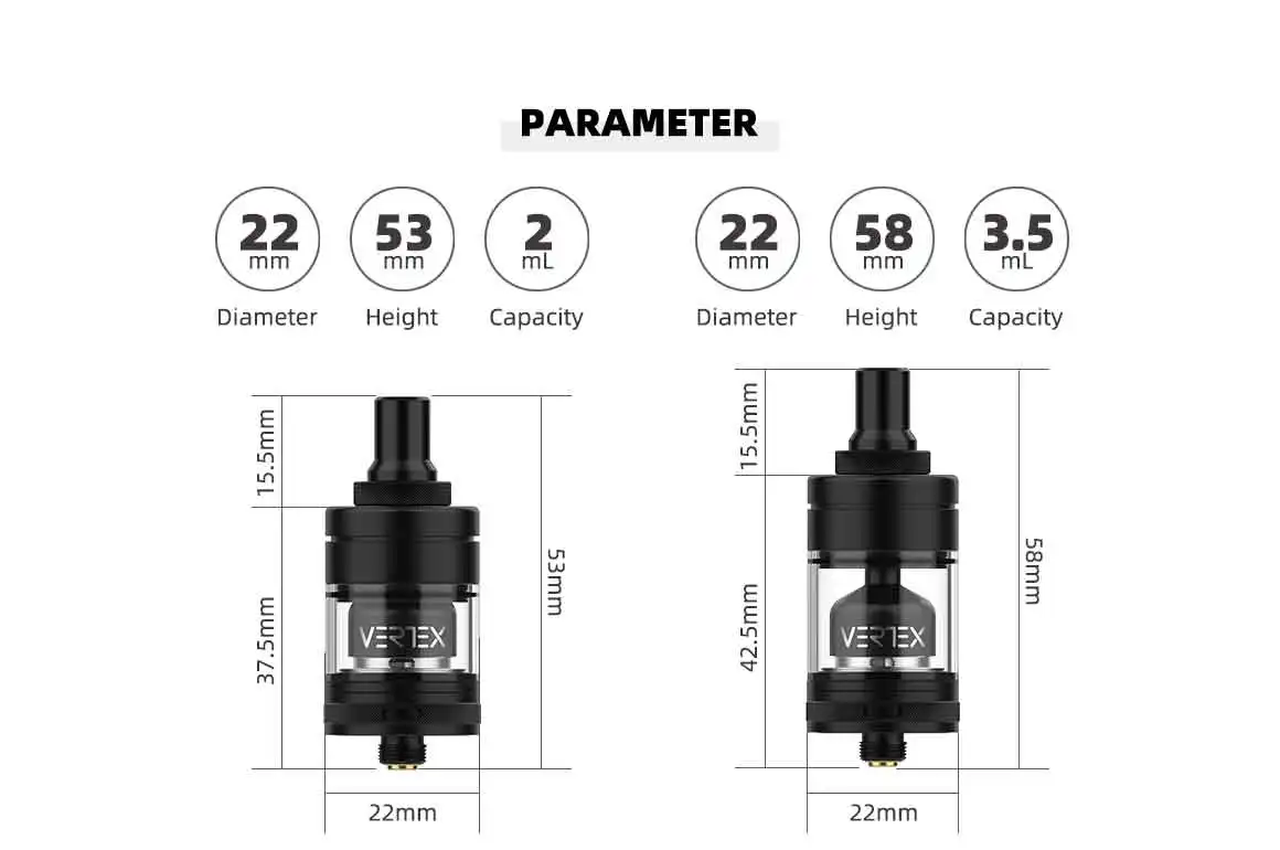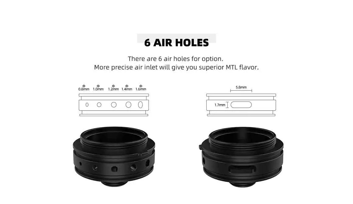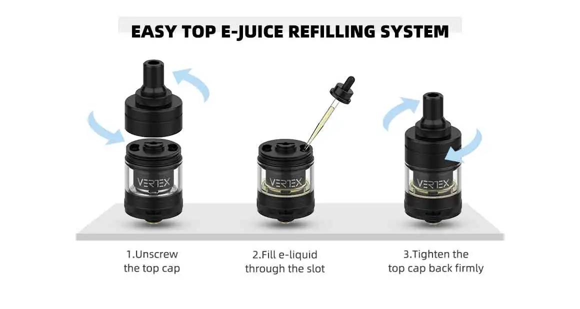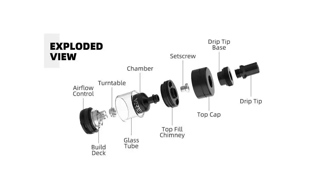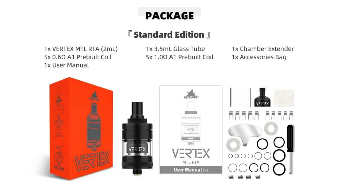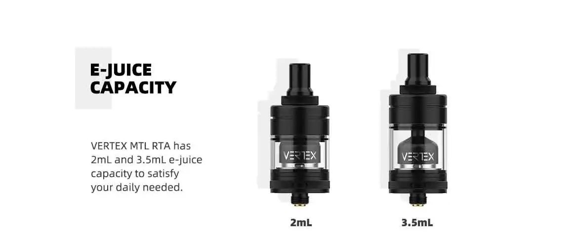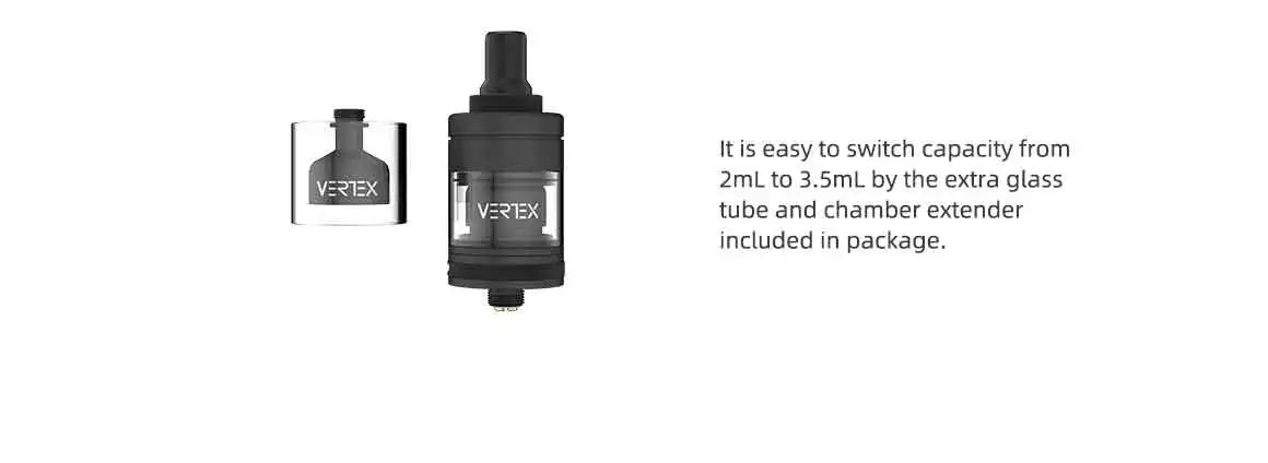 Vertex RTA est un atomiseur de réservoir reconstructible MTL de 22mm de diamètre. Vertex RTA dispose d’une configuration de bobine unique et dispose de deux poteaux côte à côte pour aider à installer la bobine facilement. Avec 6 trous d’air (0.8mm/1.0mm/1.2mm/1.4mm/1.6mm/1.7mm), il vous offrira une saveur MTL supérieure. De plus, le plateau tournant est conçu avec 3 structure d’admission de flux d’air pour offrir plus de combo de flux d’air. Le flux d’air inférieur et la poignée moletée apporteront une plus grande entrée d’air et un réglage facile du flux d’air. La capacité du réservoir est de 2ml et vous pouvez changer la capacité à 3.5ml par le tube en verre supplémentaire et l’extension de chambre dans l’emballage. Et le système de remplissage supérieur rendra le remplissage pratique. Le paquet contient également des bobines A1 préfabriquées de 0,6 ohm et 1, 0ohm.