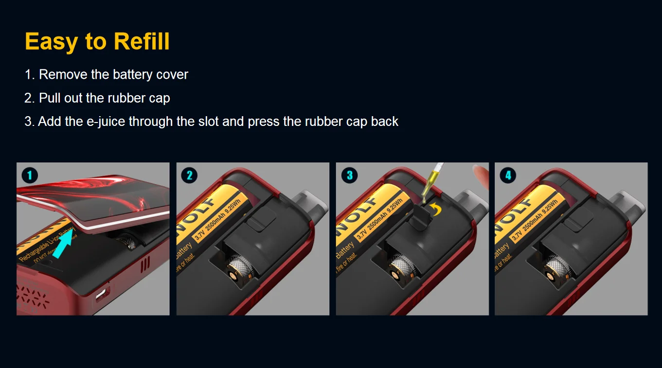 Le Pod et la batterie sont placés dans le mod. Il est pratique de démonter le couvercle en utilisant la méthode magnétique.