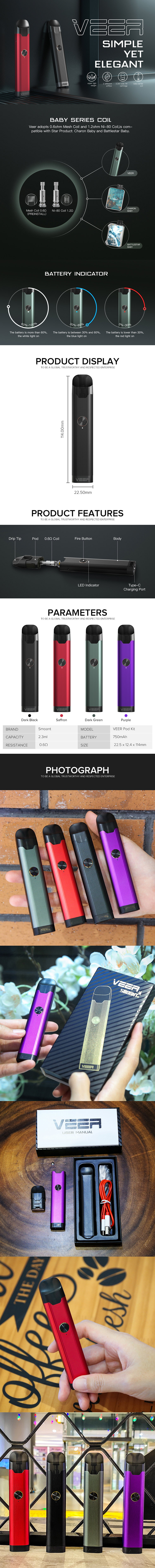 Smoant VEER Pod Kit est un appareil simple mais élégant avec les caractéristiques suivantes. La cartouche de remplissage latéral de 2.3ml au maximum évite les fuites d’e-liquide et réduit le désordre. Installez le pod dans différentes directions, vous obtiendrez 2 flux d’air différents et 2 expériences différentes. Sa bobine de 0.6Ω Mesh/1.2Ω Ni80 Baby series, est compatible avec Charon Baby & Battlestar Baby. Avec une batterie intégrée de 750mAh, il peut produire à une puissance maximale de 1 à 15W, et dispose de 3 niveaux de lumière indicateur de puissance. De plus, l’appareil est conçu avec un matériau super léger en aluminium spatial pour la structure du corps, qui ne pèse que 33.5g.