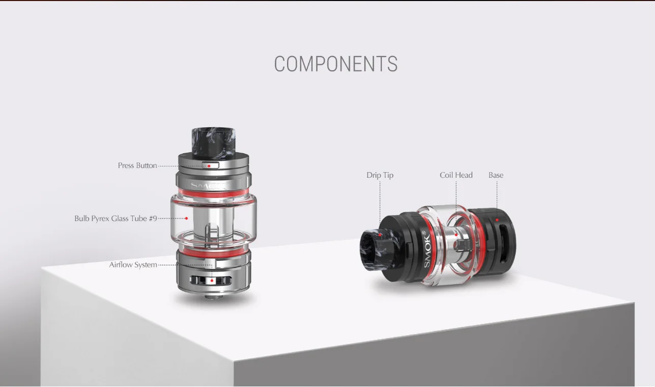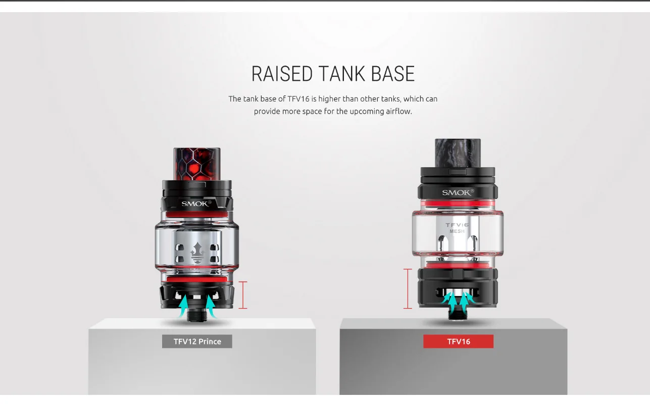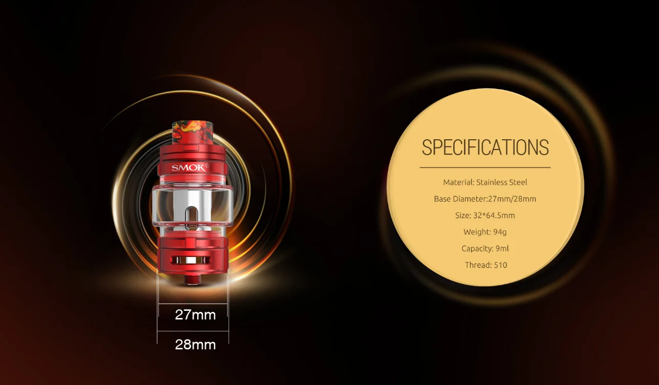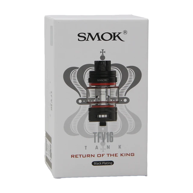 Le réservoir de Vape TFV16 de SMOK a une capacité de lager de 9ml, ce qui garantit un plaisir de vapotage durable. Avec le bouton-poussoir de verrouillage sur le capuchon supérieur, il peut empêcher la fuite d’e-jus en ouvrant accidentellement le capuchon supérieur. La base du réservoir de TFV16 est plus élevée pour fournir plus d’espace pour le flux d’air à venir. Avec la conception du système de flux d’air, il vous apportera une expérience de vapotage pure. Il dispose d’un tout nouveau connecteur de filetage 510 plaqué or, qui peut augmenter la résistance au frottement et renforcer la conductivité électrique. Le diamètre de la pointe d’égouttement en résine est de 16mm, ce qui s’adapte parfaitement à votre bouche. Il vous apportera un flux d’air accru et un effet de tirage puissant. La bobine utilise un tout nouveau design de maille structuré en nid d’abeille et le nouveau matériau, qui produira un nuage massif et une saveur dense. Disponible en 6 coloris.