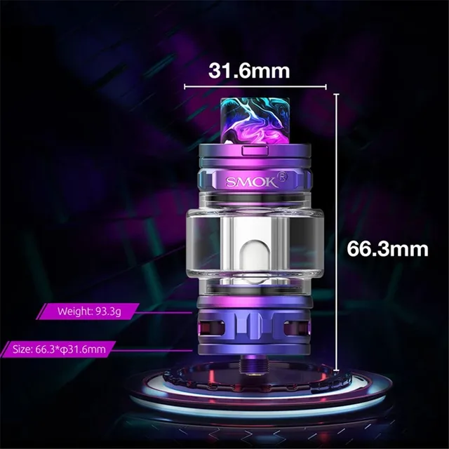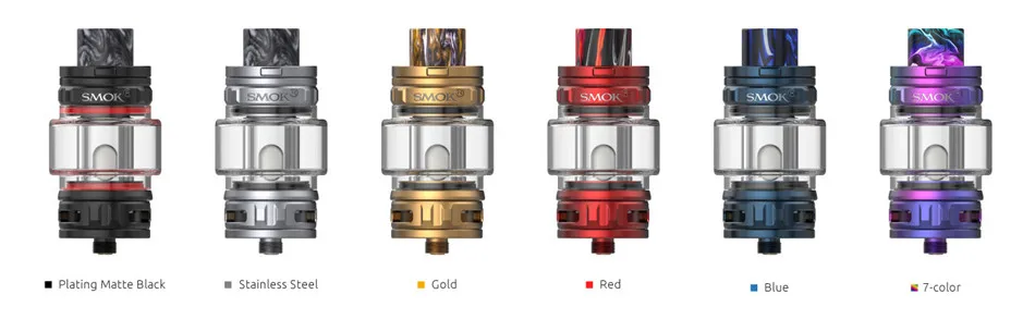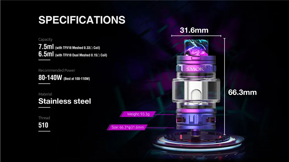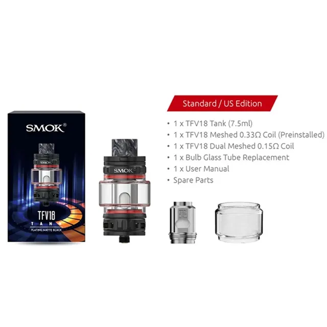 Capacité: 7.5ml (avec bobine TFV18 maille 0,33 ohm), 6.5ml (avec bobine TFV18 double maille 0,15 ohm)
