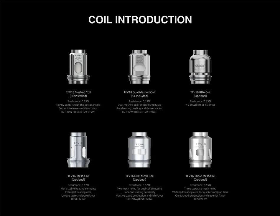 Résistance de la bobine: bobine TFV18 à maille 0,33 ohm, bobine TFV18 à double maille 0,15 ohm