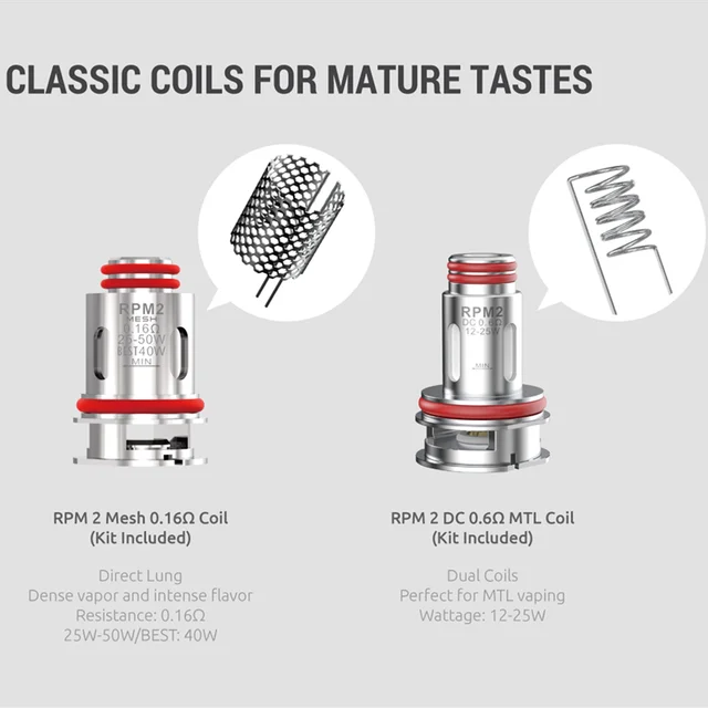 La bobine RPM2 est adaptée au Kit SMOK SCAR-P3/SCAR-P5. Il est livré avec 2 types de bobines: bobine Mesh 0,16 ohm (25-50W) et bobine DC 0,6 ohm MTL. Il vous fournira une vapeur et une saveur de haute qualité, il suffit de l’obtenir pour votre appareil. 5 pièces par paquet.