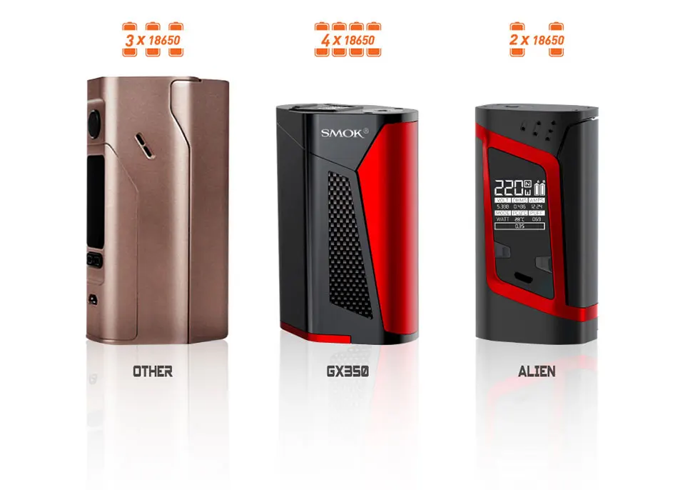 Le mod a toujours une taille très lourde lorsqu’il est alimenté par 4×18650 batteries; Alors que GX350 a réduit la taille entière après un calcul précis, qui est plus petit que les autres mods alimentés par 3×18650