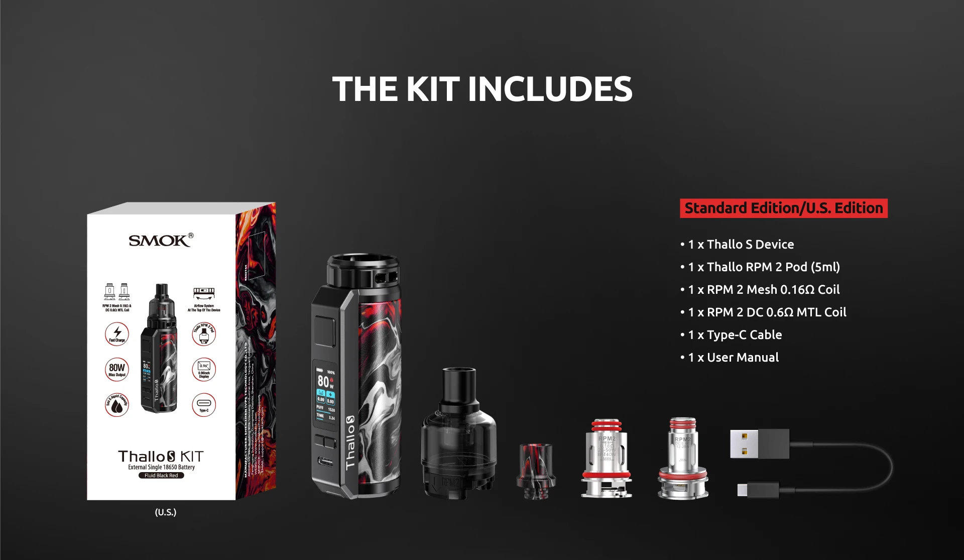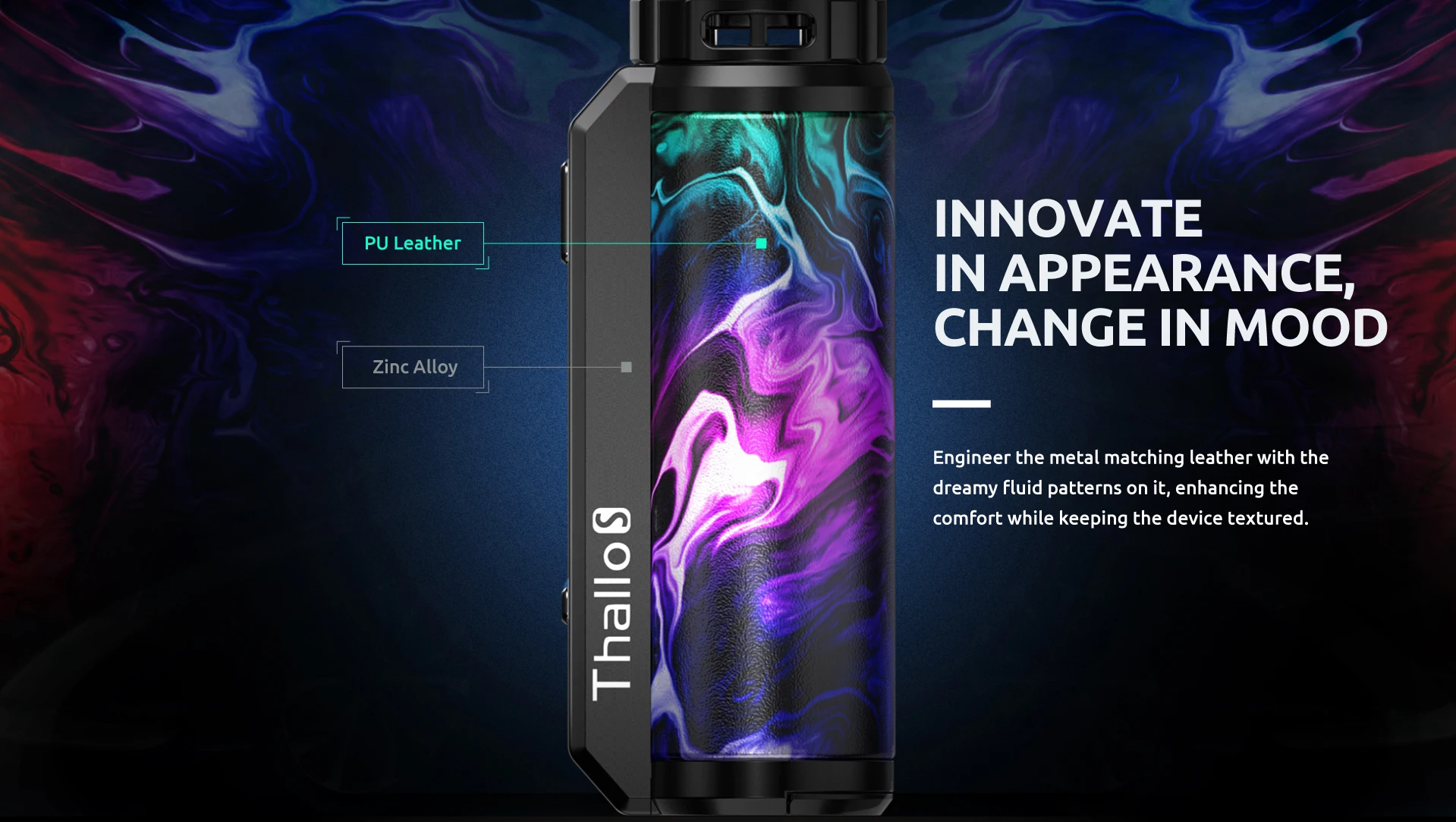 Thallo S Kit est un kit de système pod mod qui est livré avec un aspect à la mode, une structure compacte et un design ergonomique. Par rapport à ceux avec batterie nominale, il est compatible avec une batterie externe 18650 ou 21700. Et la puissance extrême varie du type de batterie installé, 80W correspondant à 18650 et 100W à 21700. De Plus, elle est surveillée par nouveau IQ-XS puce avec 0.001s vitesse de tir. Et il y a un écran de 0.96 pouces pour afficher vos détails de vapotage. En outre, il y a une conception d’aimant puissant entre le pod et l’appareil parfaitement. Et il est compatible avec 2 types de dosettes: la dosette Thallo RPM 2 et la dosette Thallo RPM (vendues séparément). De plus, sa grande capacité de dosette de 5ml vous évite de remplir fréquemment la dosette. Il vous permet également d’ajuster le flux d’air en fonction de vos préférences gustatives. De plus, il prend en charge les bobines de la série RPM pour vous apporter un coup de gorge plus fort et des nuages plus denses.