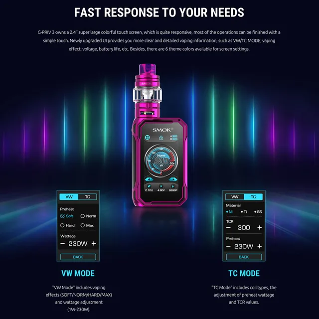 Comprend un mod box moderne alimenté par un nouveau jeu de puces, qui peut fournir jusqu’à 230 watts de puissance. C’est 2.4