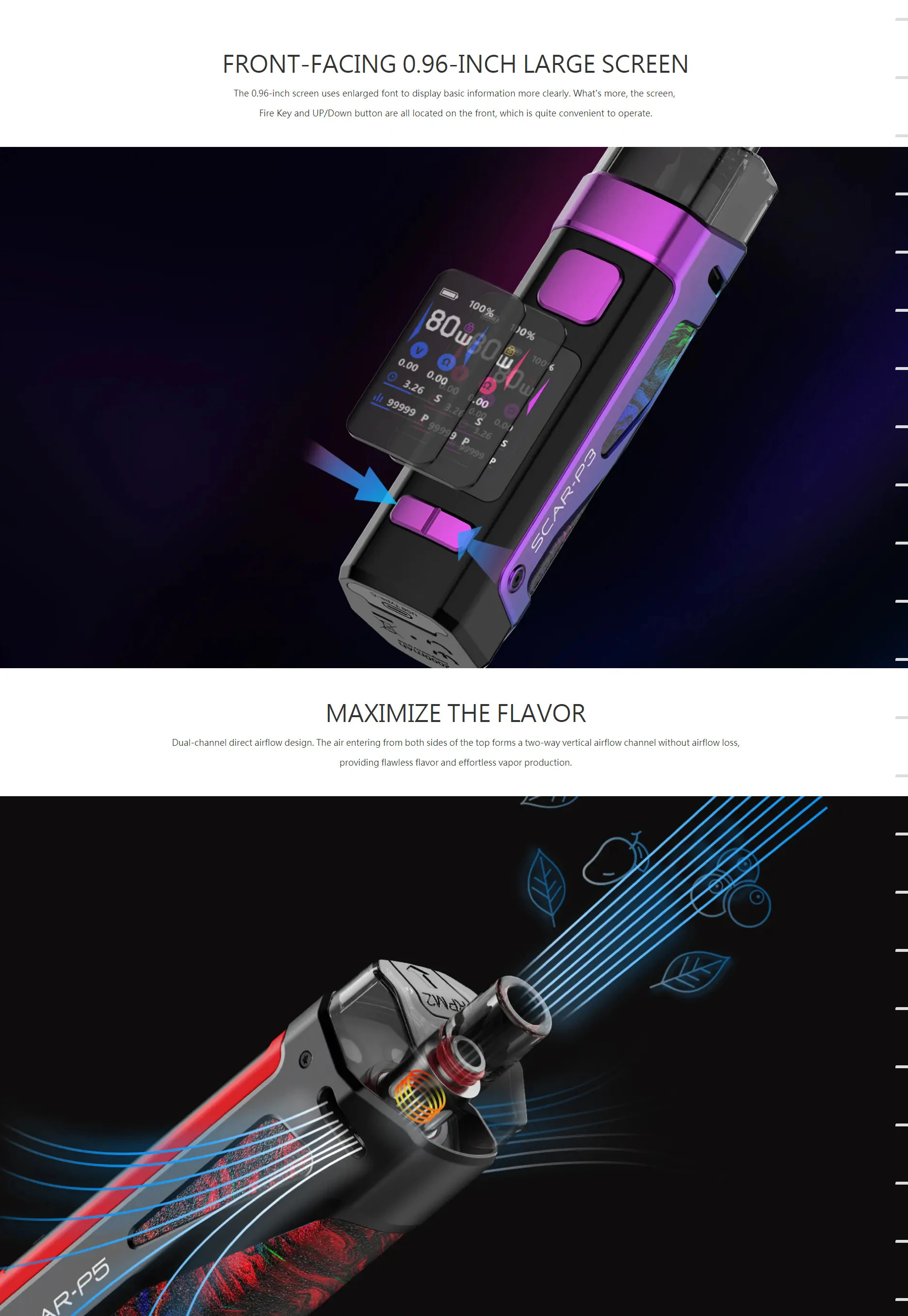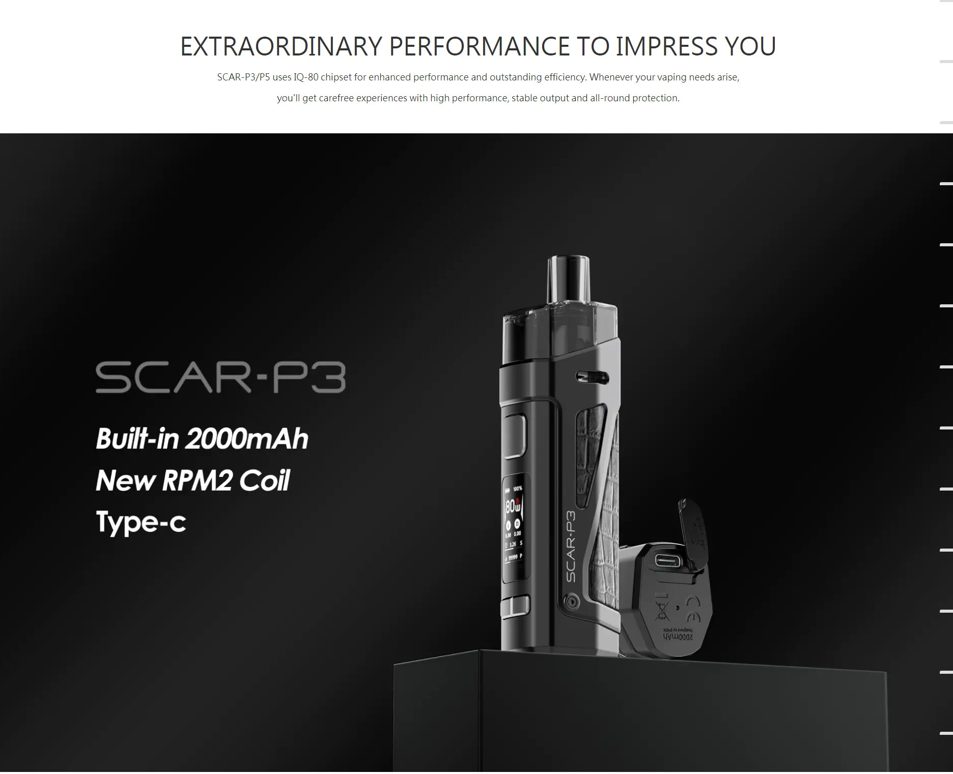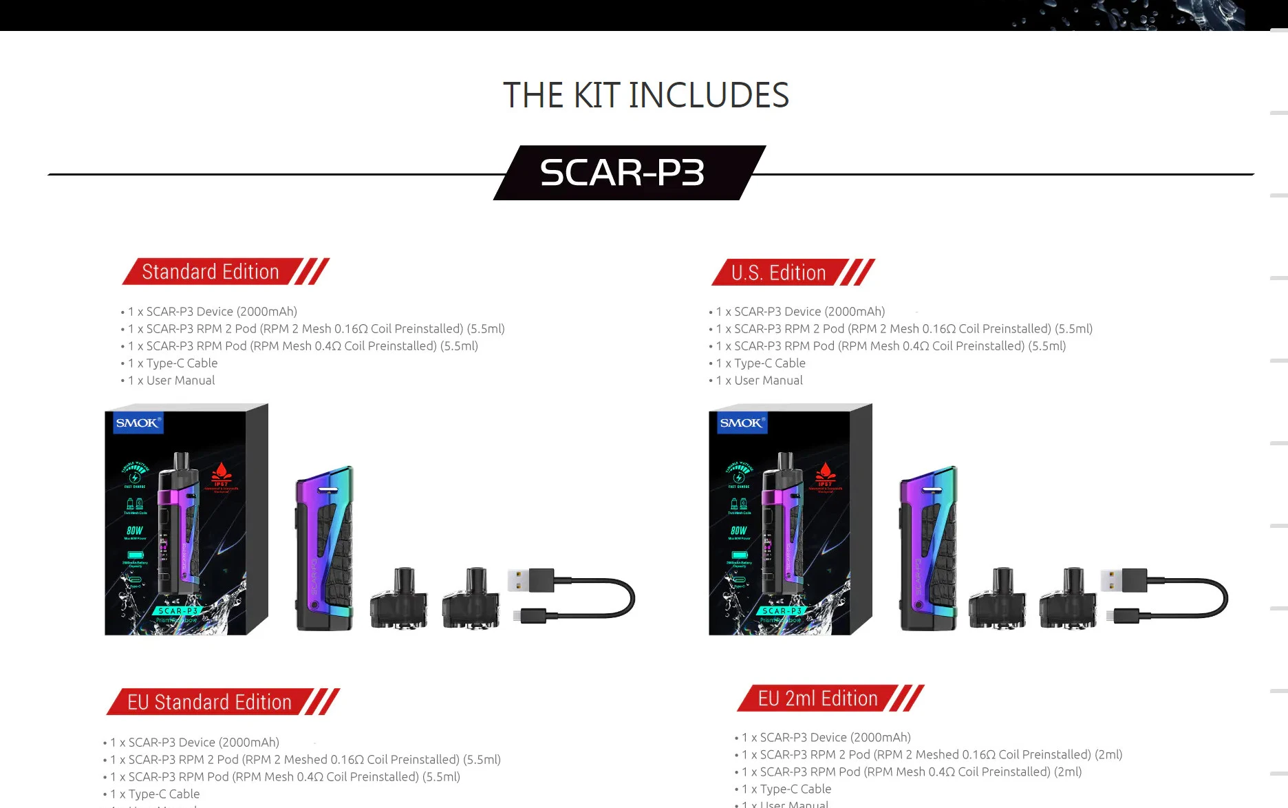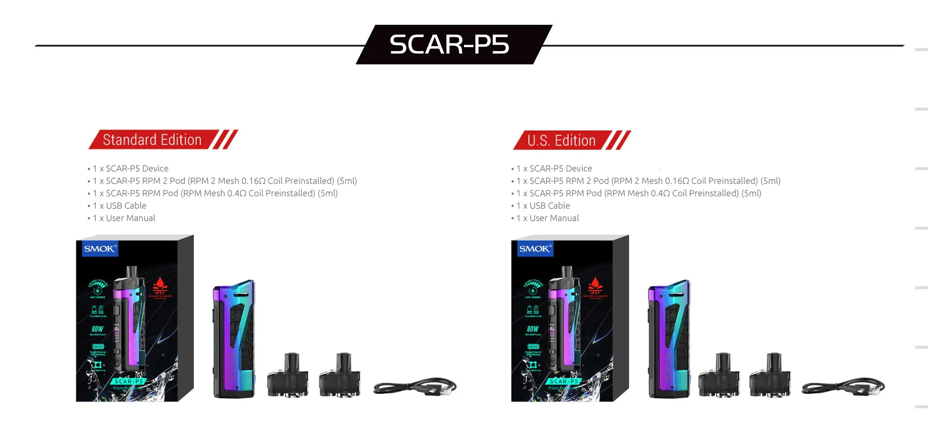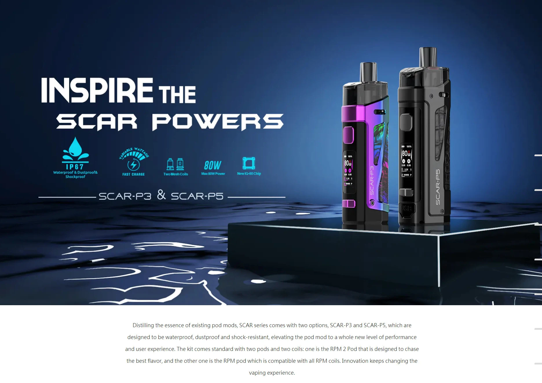 Distillant l’essence des mods de dosettes existants, la série SCAR est livrée avec deux options, SCAR-P3 et SCAR-P5, qui sont conçues pour être imperméables, antipoussière et antichocs, élever le mod pod à un tout nouveau niveau de performance et d’expérience utilisateur. Le kit est livré en standard avec deux dosettes et deux bobines: l’une est la dosette RPM 2 qui est conçue pour rechercher la meilleure saveur, et l’autre est le pod RPM qui est compatible avec toutes les bobines RPM. L’innovation ne cesse de changer l’expérience de développement.