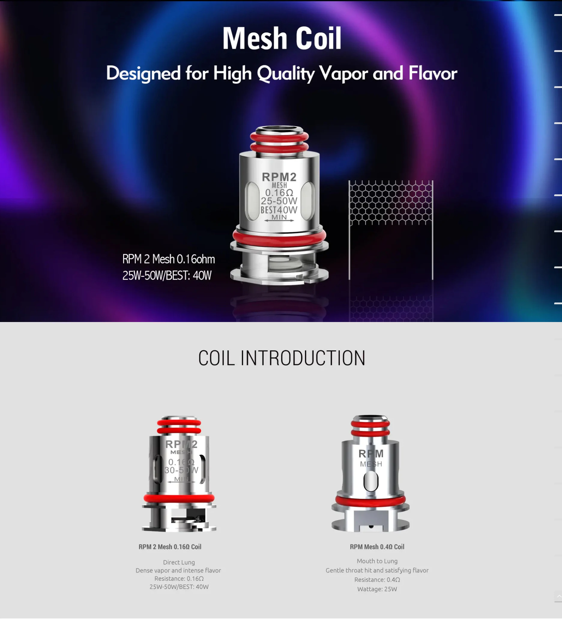 | Coil | RPM 2 Mesh 0.16ohm / RPM Mesh 0.4ohm |