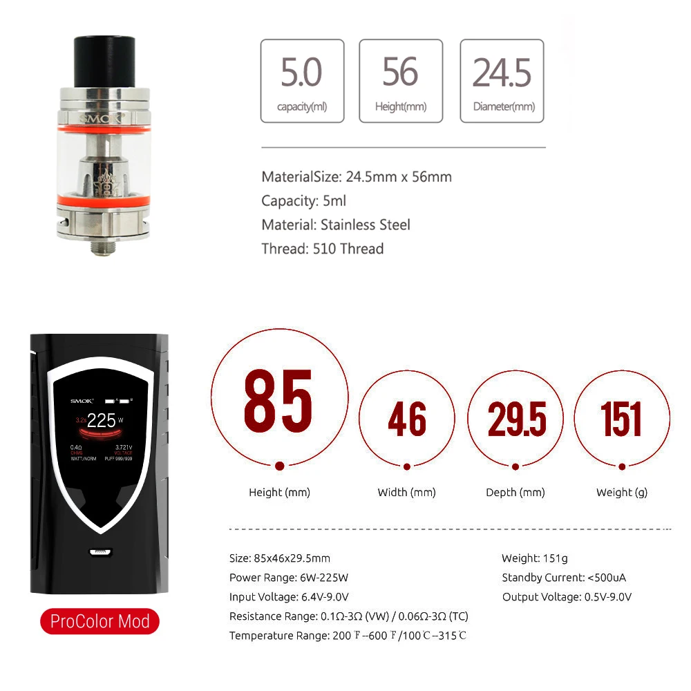 SMOK Cigarette Électronique Original Procolor Box Mod, Puissance 225 W, Compatible avec Modèle V8 Baby Tank et TFV12 Prince Atomiseur Vaporisateur