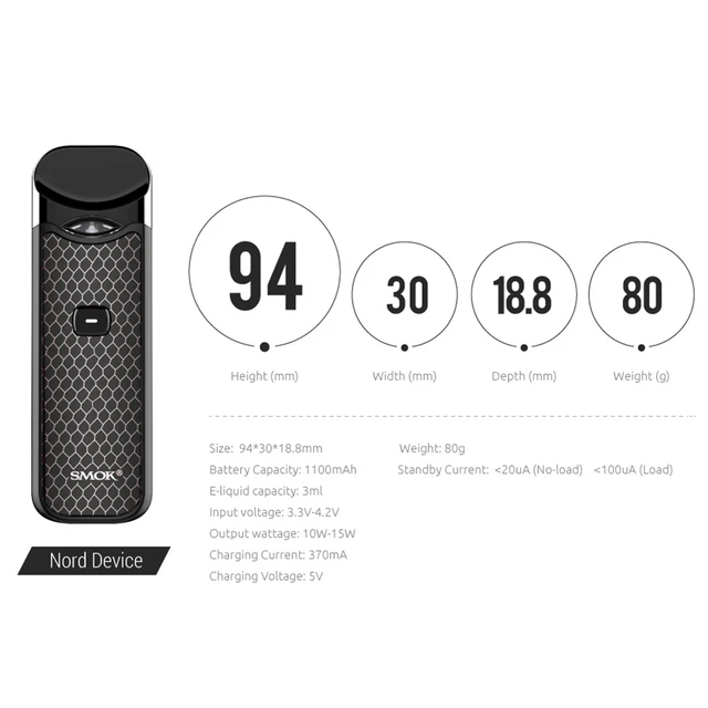 Nord est un dispositif de système de pod à déclenchement par bouton nouvellement conçu. Il a une capacité de batterie de 1100mAh, extrêmement grand parmi les appareils du système pod, ce qui en fait un appareil vraiment puissant! Il est équipé de deux bobines exclusives, la bobine Nord Mesh 0.6Omega et la bobine Nord regular 1.4Omega, l’une est parfaite pour obtenir une vapeur massive; L’autre peut offrir une excellente expérience MTL. Il a également une taille parfaite à tenir en main, un bouton nouvellement ajouté pour commencer à vapoter et fournir des informations sur la durée de vie de la batterie, en plus, il y a une fenêtre e-liquide sur le pod, tout cela pour votre commodité! L’innovation ne cesse de changer l’expérience de vapotage!