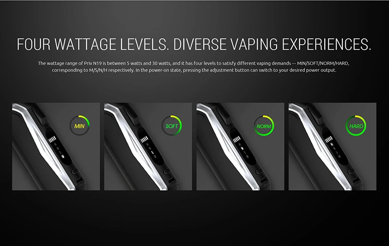 Le Kit SMOK Priv N19 se compose du Mod Priv N19 et du réservoir Vape Pen Nord 19. Il est alimenté par une batterie rechargeable intégrée de 1200mAh et prend en charge quatre options de contrôle de la puissance de 5 watts à 30 watts (M/S/N/H) en appuyant sur le bouton de réglage. Il offre également plus de detai led LUMIÈRE LED indications via cinq barres énergétiques pour afficher plus spécifiques de vie de la batterie et l’état de charge. Il dispose d’une clé de tir latérale intelligente pour un fonctionnement à un seul bouton. Le réservoir inclus est livré avec une capacité de 2ml de jus électronique et adopte deux bobines Nord, la bobine Nord Mesh 0.6Ω parfaite pour la vapeur massive et la bobine Nord Mesh-MTL 0.8Ω offrant une excellente expérience MTL. Plusieurs protections sont appliquées pour éviter les risques potentiels. En Plus de la conception de remplissage par le haut facile et du système de flux d’air réglable, vous profiterez de vrais plaisirs de vapotage. 6 couleurs disponibles: 7 couleurs et noir, noir rouge, prisme bleu et noir, prisme Chrome et noir, or noir et vert noir.