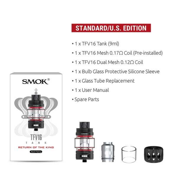 Équipé de deux nouvelles bobines de maille pour la meilleure saveur et la vapeur maximale. En adoptant une ampoule géante tube de verre pyrex, TFV16