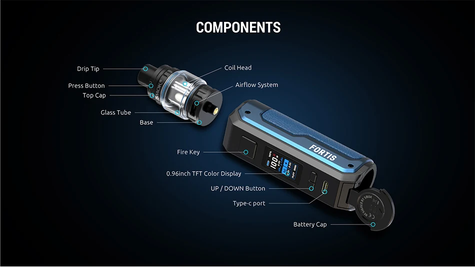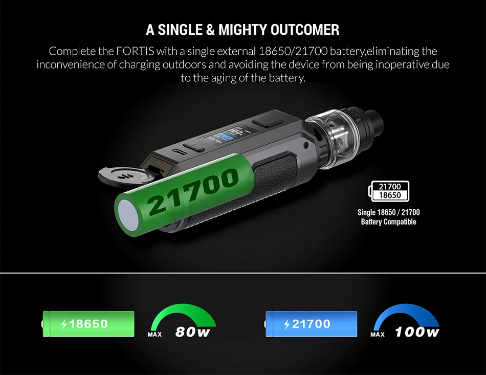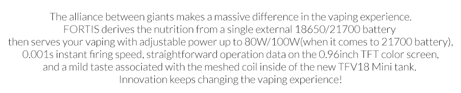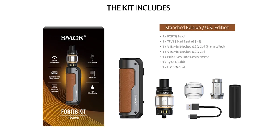 SMOK Fortis kitprésente un cuir élégant sur le dessus de son corps, le design ergonomique le rend facile à saisir et antidérapant. Alimenté par une seule batterie externe 18650 / 21700, sert ensuite votre vapotage avec une puissance réglable jusqu’à 80w. Chipset intelligent intégré, dispose d’une vitesse de tir instantanée de 0.001s, données de fonctionnement simples sur l’écran couleur TFT de 0.96 pouces, avec des boutons de fonctionnement, vous pouvez régler la puissance et la fonction ou plus. Le Mini réservoir TFV18 de 6.5ml est livré avec deux bobines de maille (une pré-installée), avec une valve de contrôle du flux d’air inférieur réglable, le Mini réservoir TFV18 apportera certainement une toute nouvelle expérience de vapotage! Le système de remplissage supérieur est facile à utiliser et efficacement étanche.