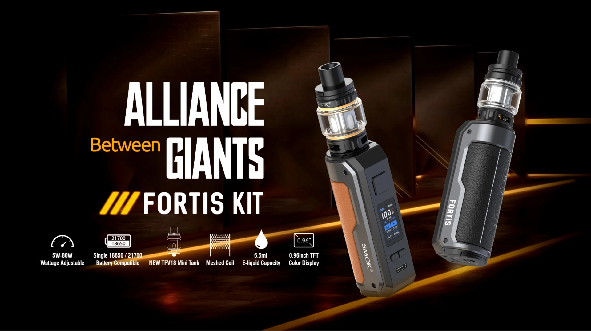 Fortis Kit est issu du Kit Thallo & Thallo S essayé. Il est combiné avec Fortis Mod et le nouveau Mini réservoir TFV18, avec cuir pleine fleur pour un poids plus léger. SMOK Fortis Kit provient de la nutrition d’une seule batterie 18650/21700 (non incluse), vous pouvez charger rapidement via le port de Type C. SMOK Fortis Mod sert votre vapotage avec une puissance réglable jusqu’à 80W, vitesse de tir instantanée de 0.001s. Le Mini réservoir TFV18 fournit un système de flux d’air droit de bas en haut, permettant une saveur riche dans un temps limité. Le réservoir adopte des Mini bobines V18 d’une grande capacité de 6.5ml pour faire une différence massive dans l’expérience de vapotage.